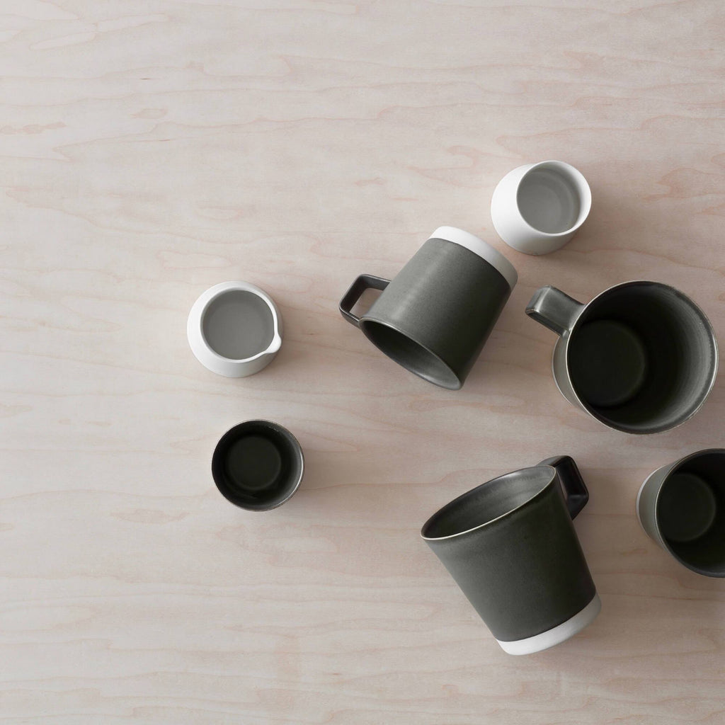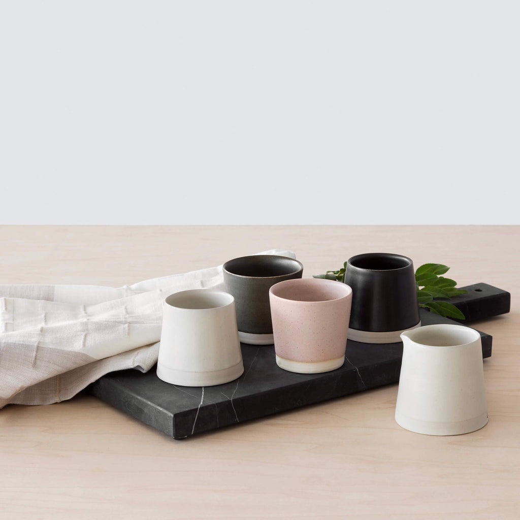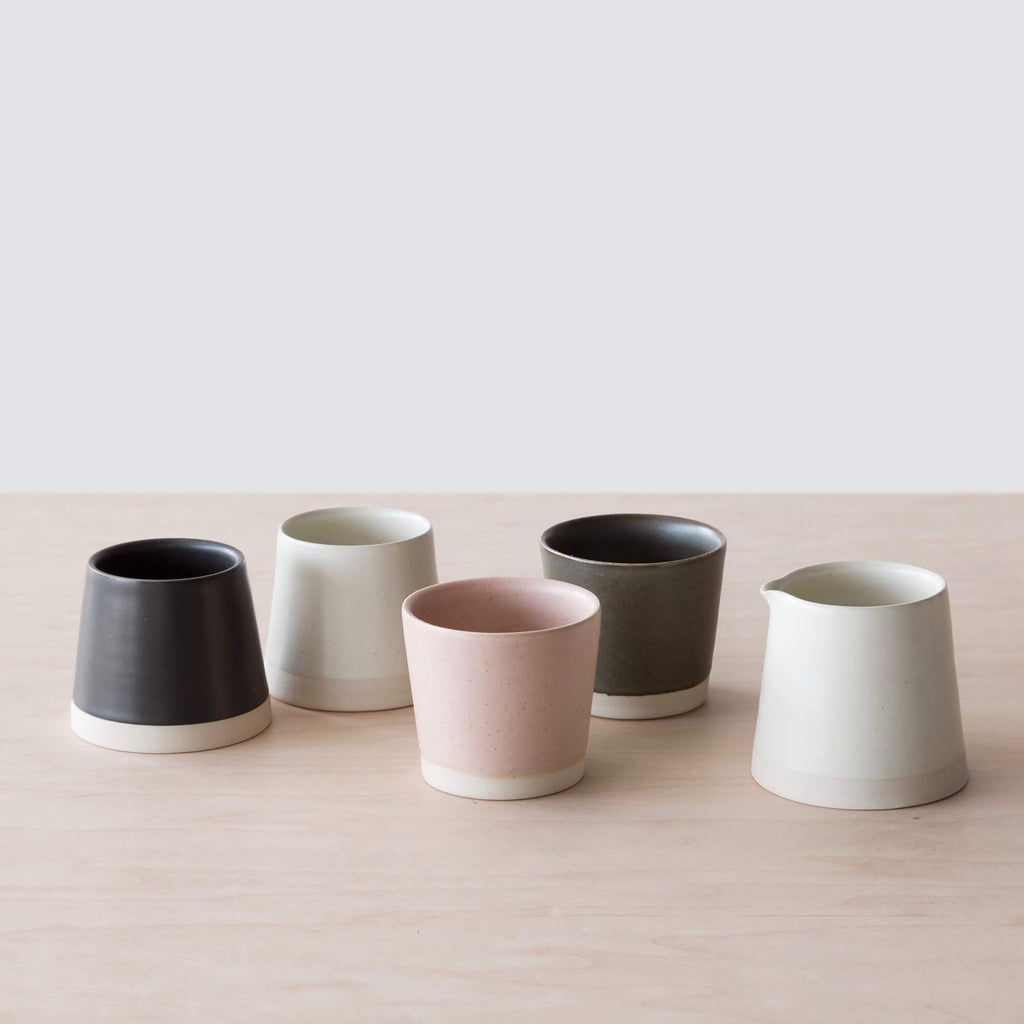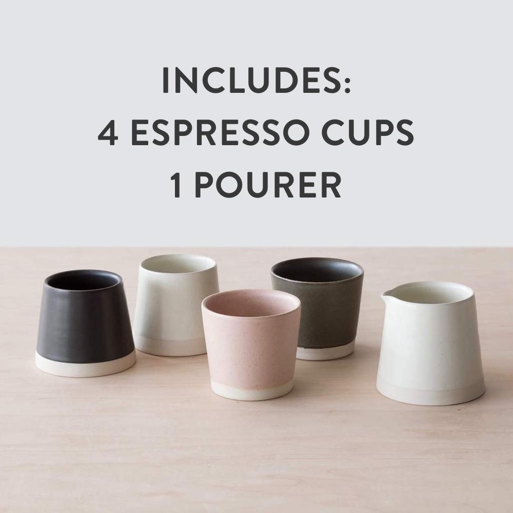 - COLOR: This set features 4 espresso cups – blush, olive, black and cream. It also includes a pourer in cream