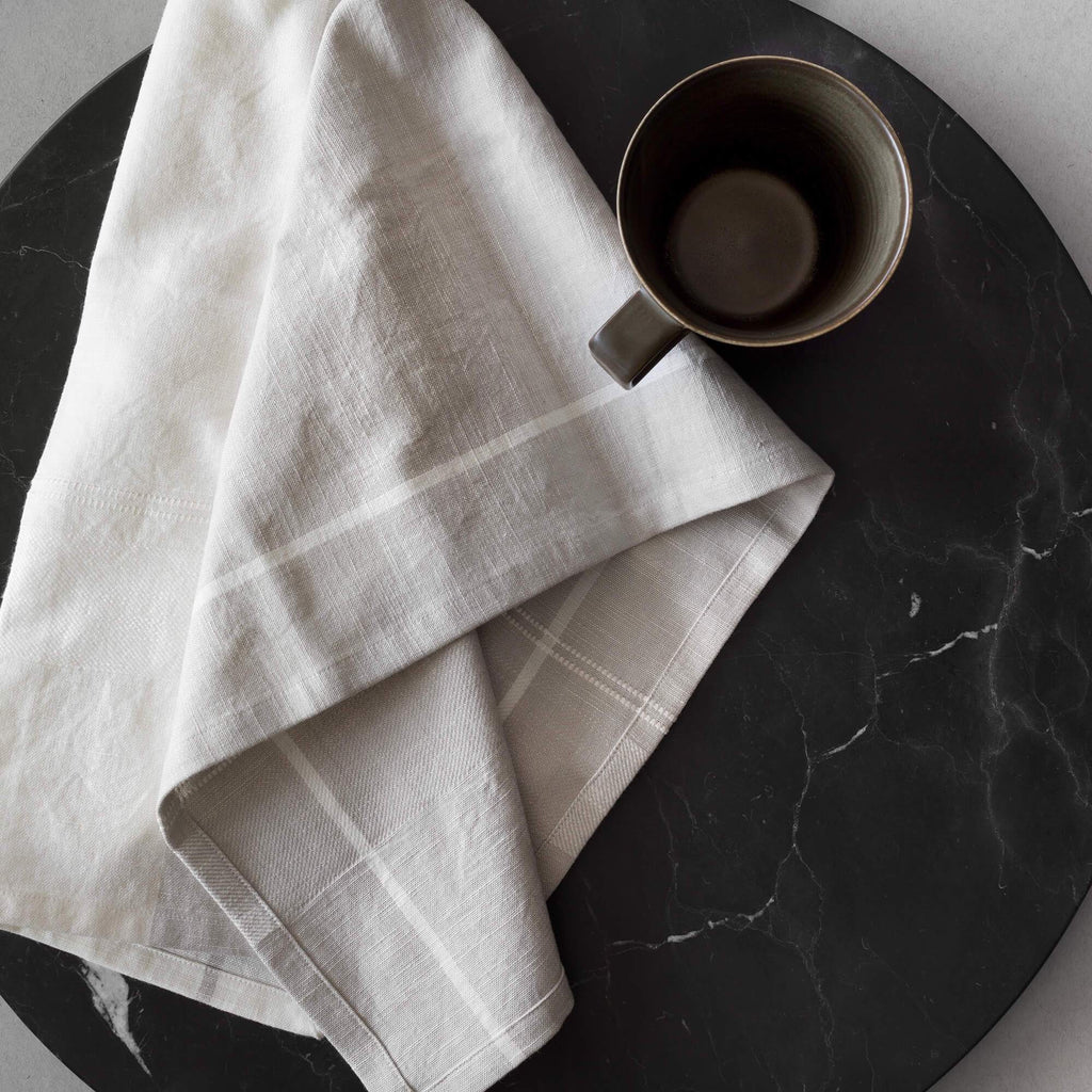 Hand-loomed from locally-sourced cotton, this set of kitchen towels is lightweight, absorbent, and oh-so-soft. Featuring a minimal, color-block design in a soft palette of tan and off-white, they bring a light, airy look to any counter.