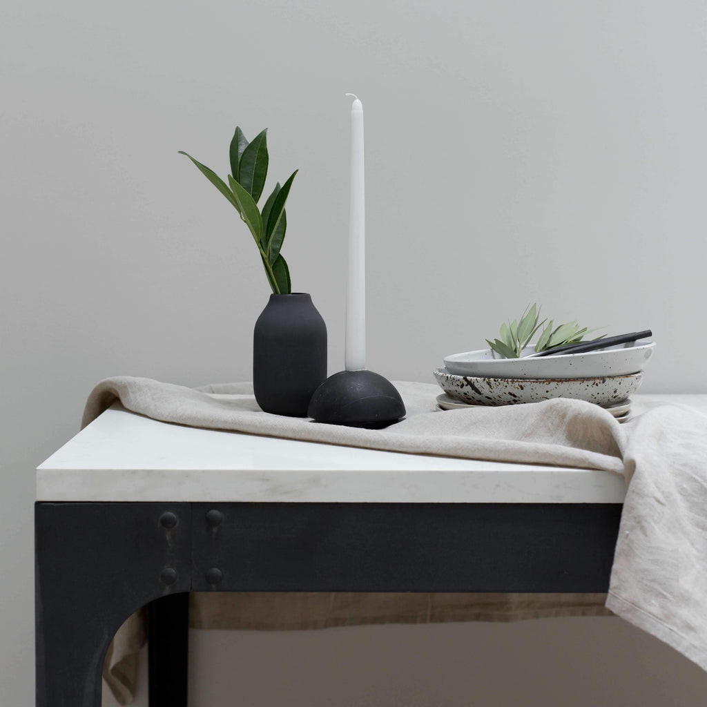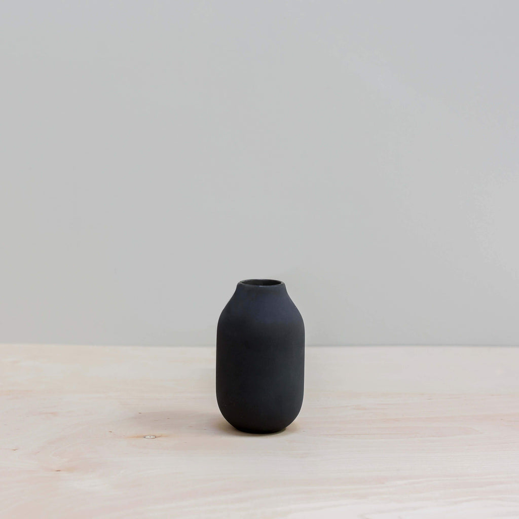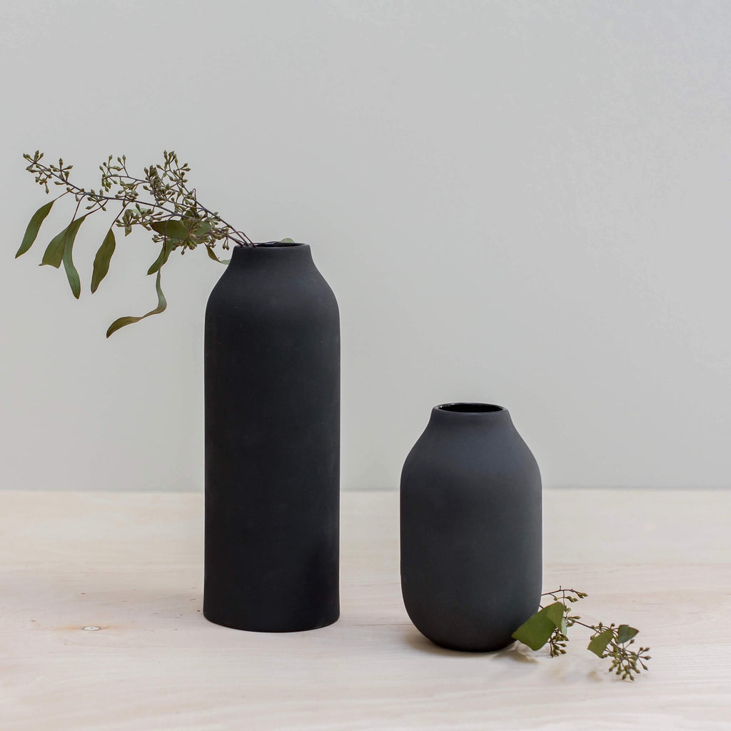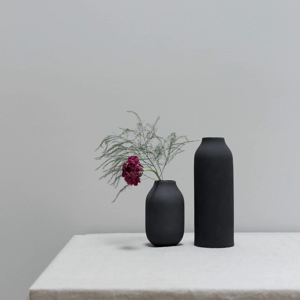 The sleek look of black matte clay combines with smooth, streamlined curves in this beautiful vessel. With its glazed interior, this petite vase is our favorite way to style fresh florals. And for a high-impact look, we opt for pairing as a set of three.