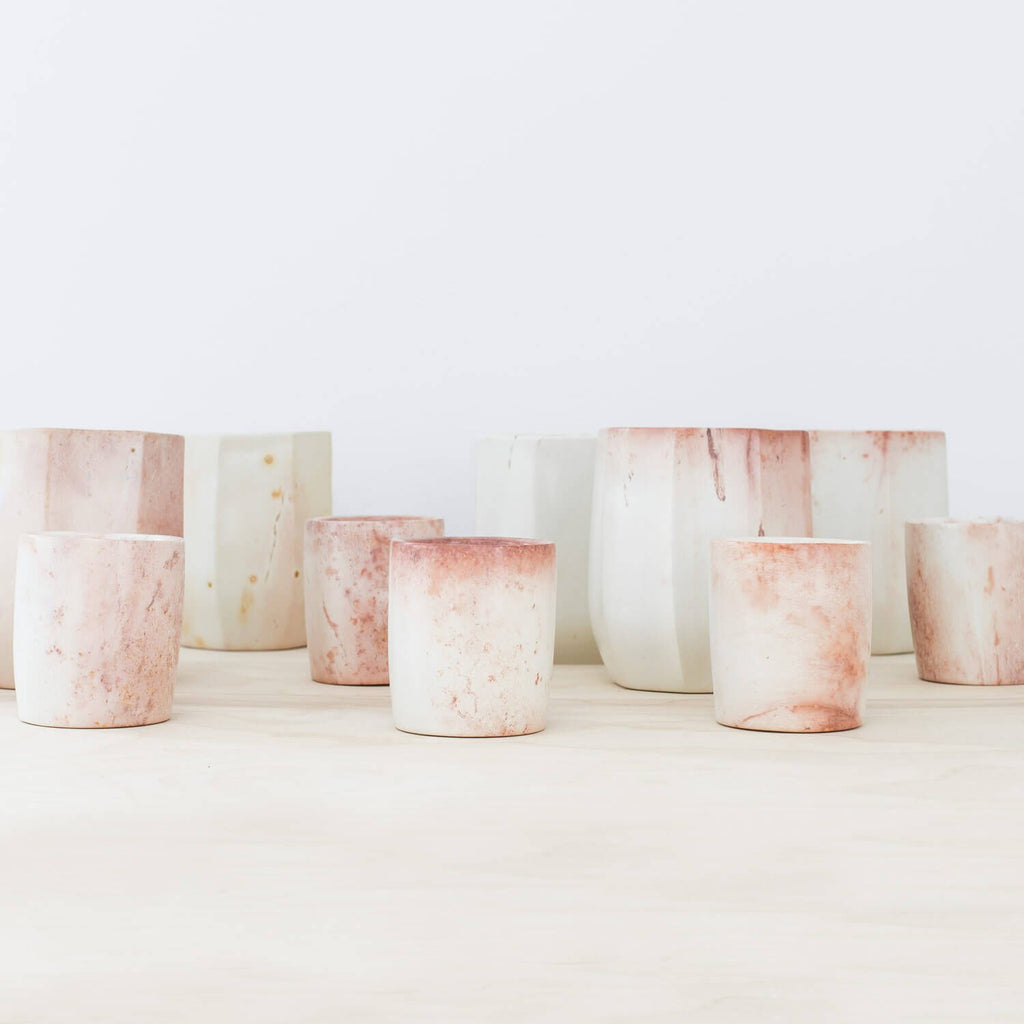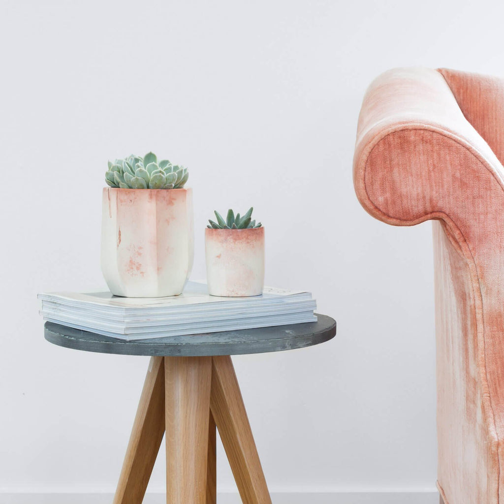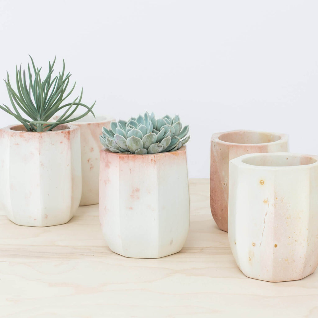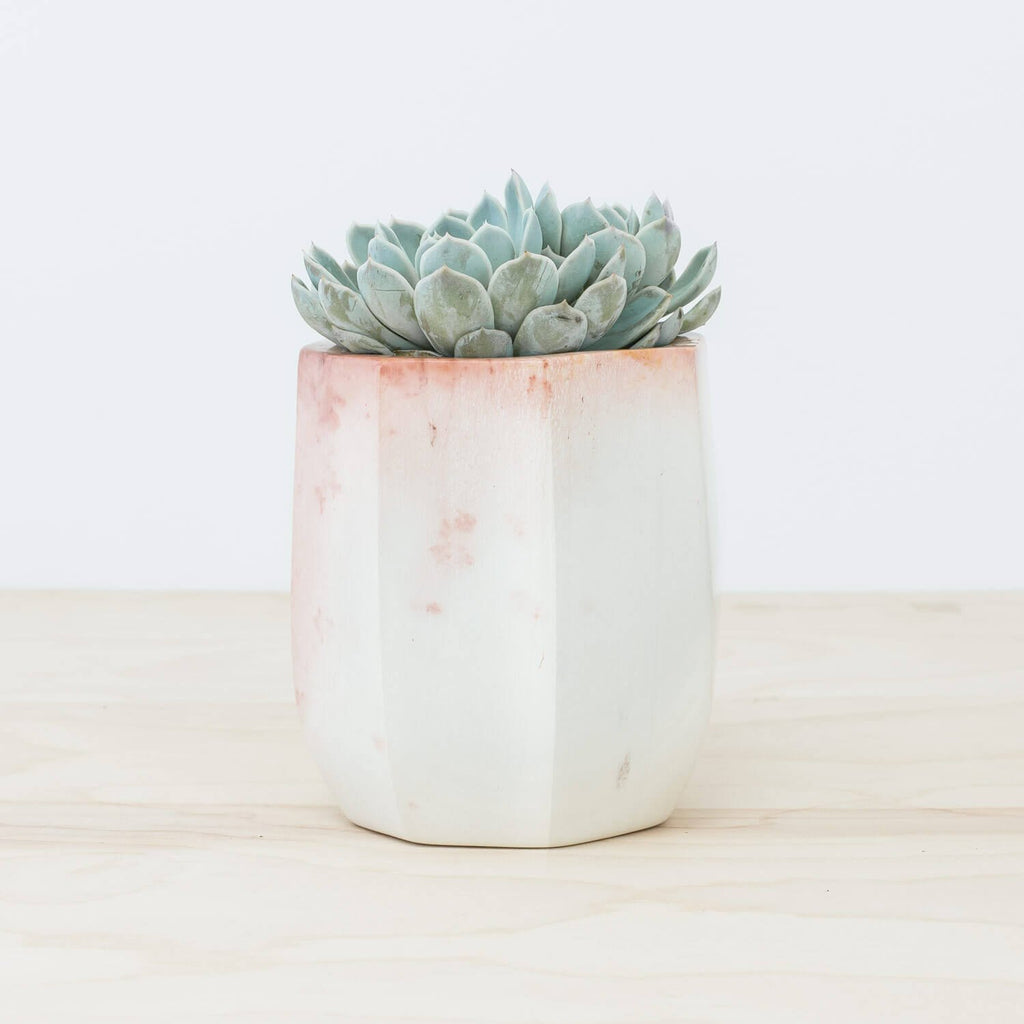 Hand-carved from rare Kenyan soapstone, this geometric planter is quite the head-turner with its marbled blush tones and structured lines.