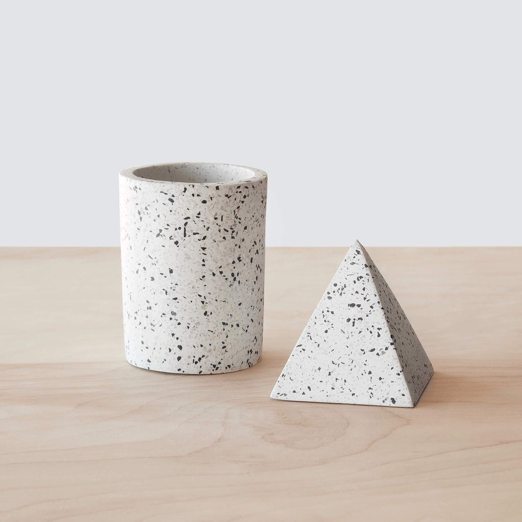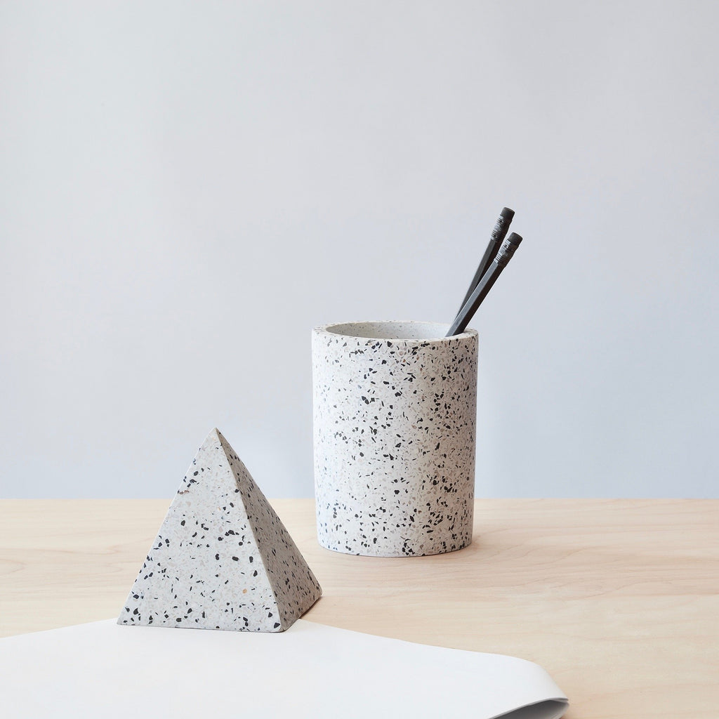 Bring a bit of mid-mod style to your workspace with this two-piece terrazzo desk set. This set includes a striking little vessel to corral all your odds and ends and a sculptural pyramid to keep your papers in place. Style with the Puebla Marble Tray for a completely polished look.