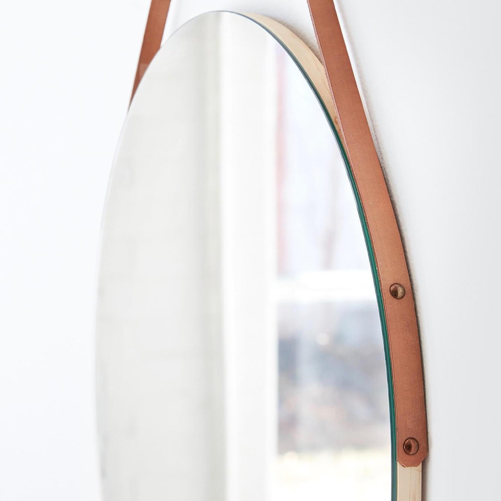 • MATERIALS: Glass mirror with light wood veneer siding, leather strap, marble hook