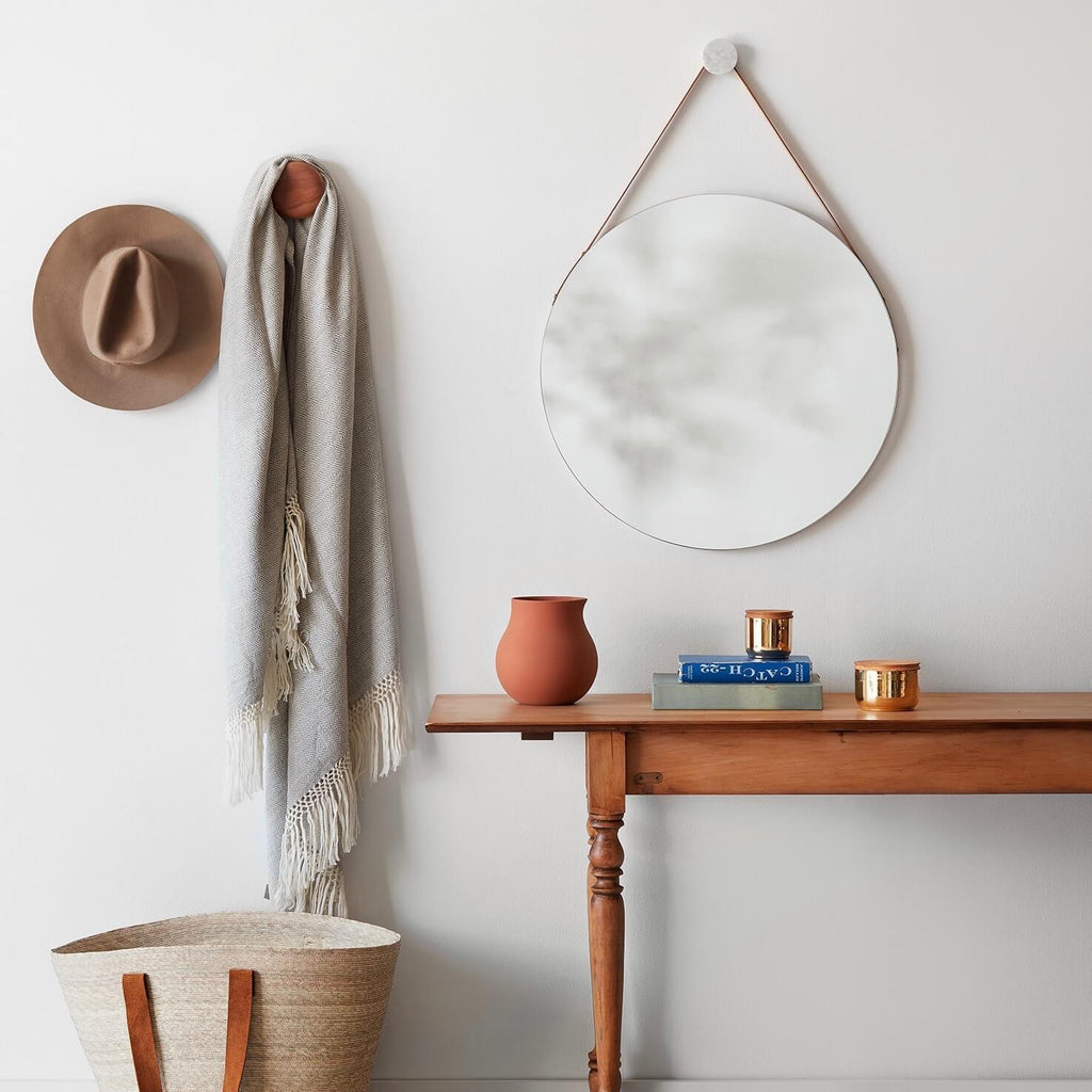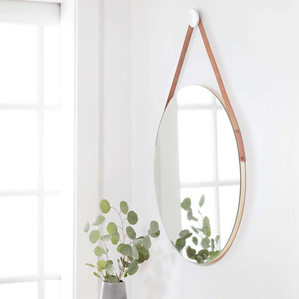 The leather strap and marble hook really elevate this simple mirror. The size is perfect. Getting the hook and strap hung just right takes a little extra effort but worth it.