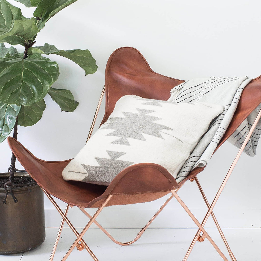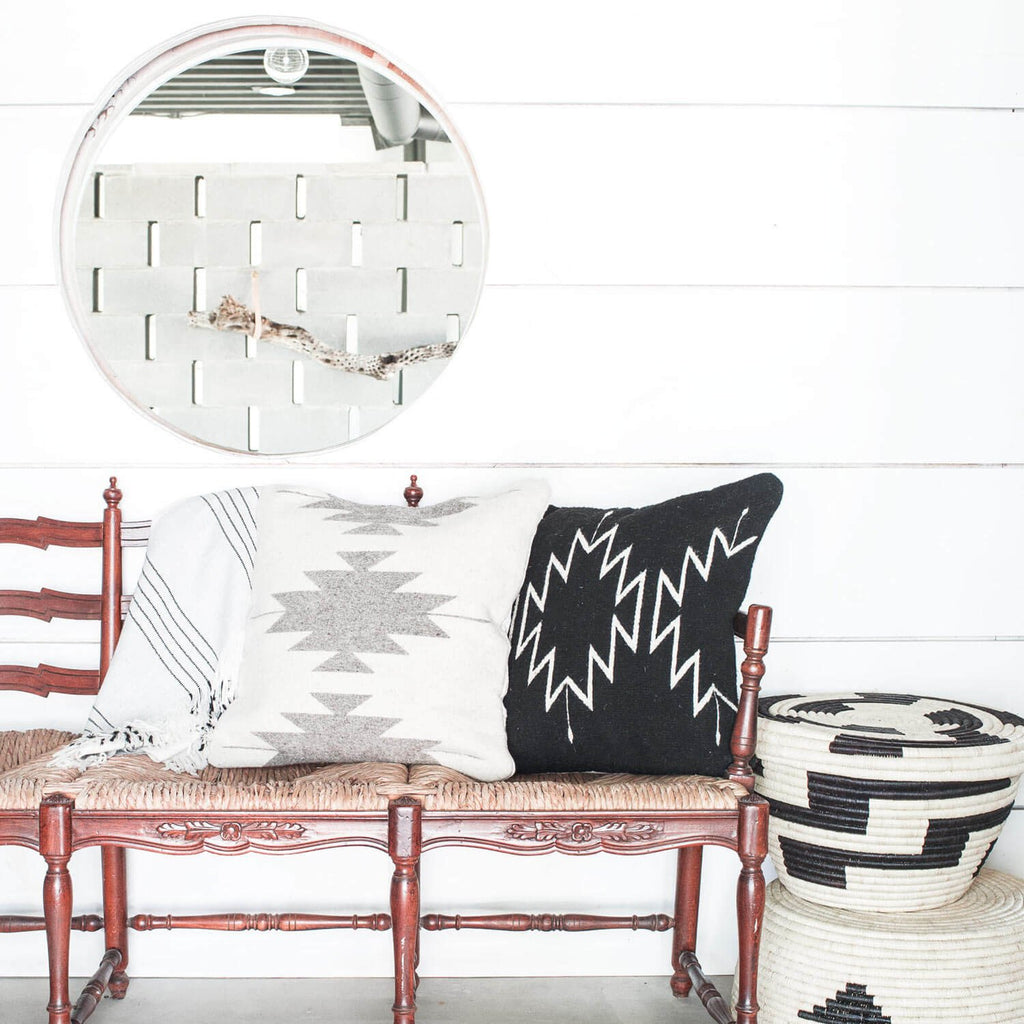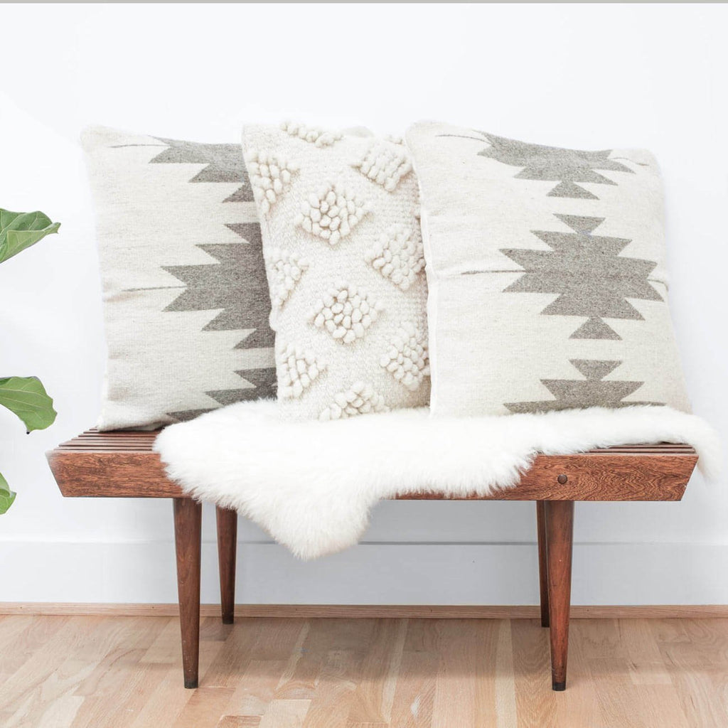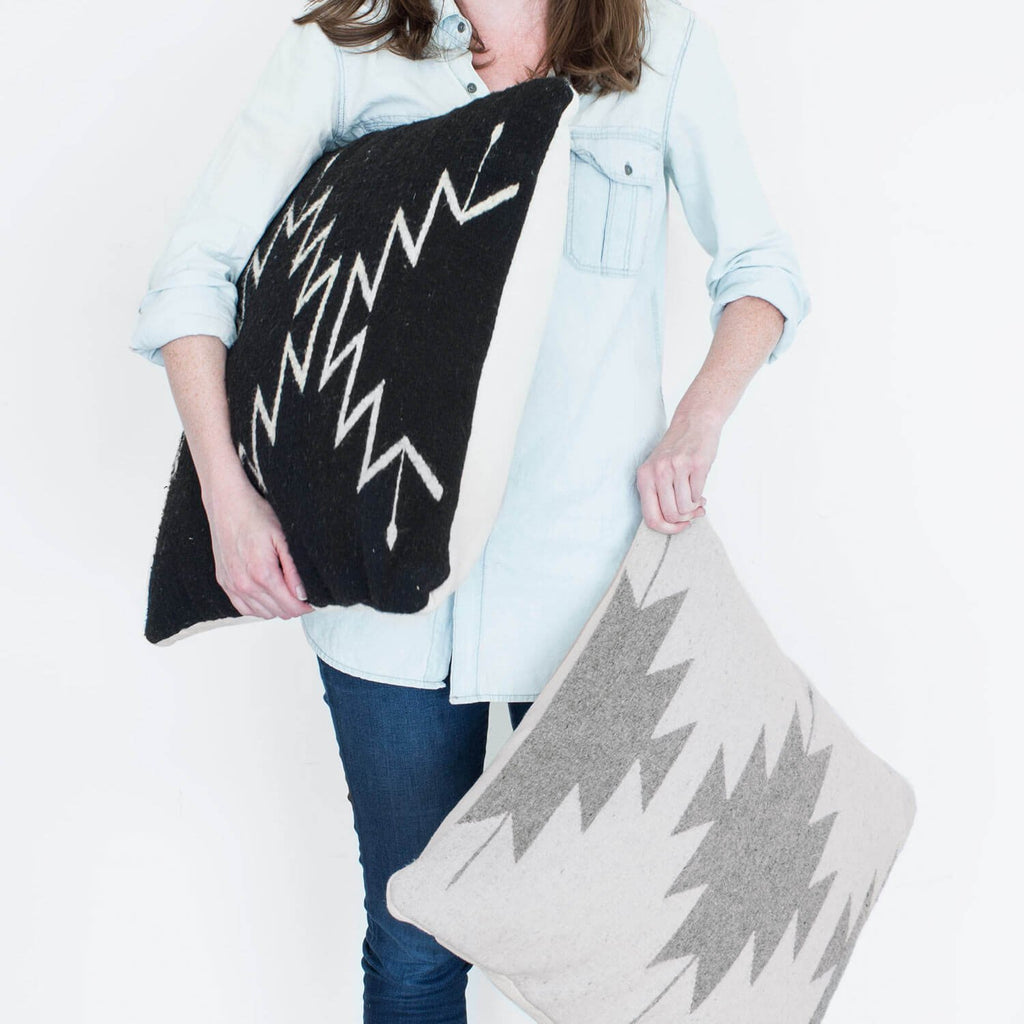 The pillow is handwoven using sheep’s wool from the local community. From start to finish, each one takes three days to complete, all made by a fair trade cooperative of 14 Zapotec women who live and work in Oaxaca.
