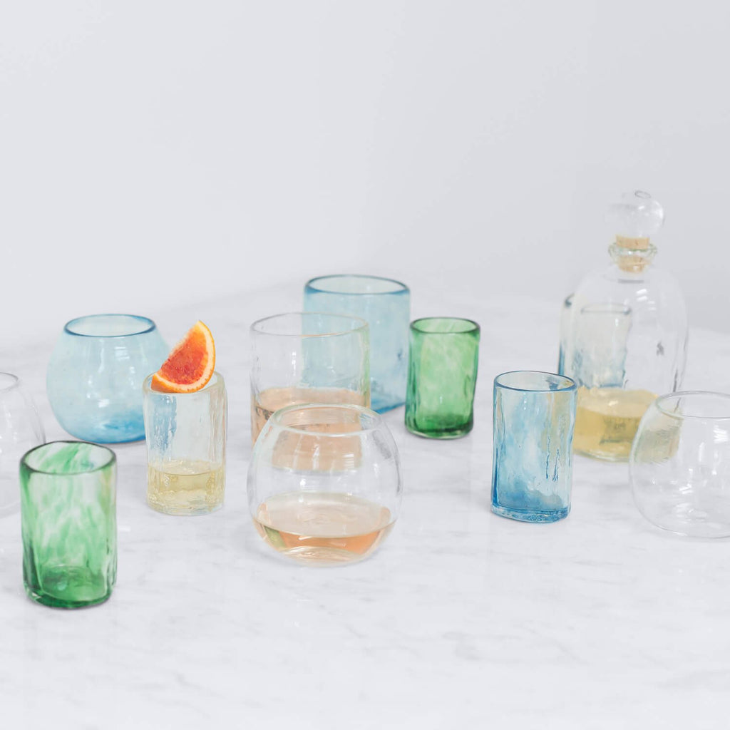 Handcrafted by a studio of 19 glassblowers, each piece is a one-of-a-kind work of art, featuring subtle variation in color and shape. All made exclusively in a fair trade environment.