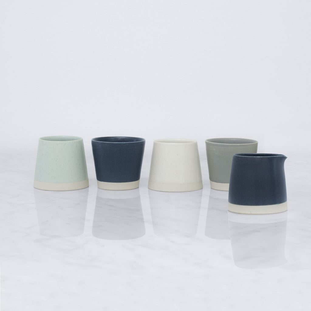 I love the barista set, perfect for a morning espresso & also looks great on my shelf! The varied cup forms and colors are delightful + small milk pour is a great addition to the set. Absolutely love the colors, they are subtle & even better in person. Love, love, love!