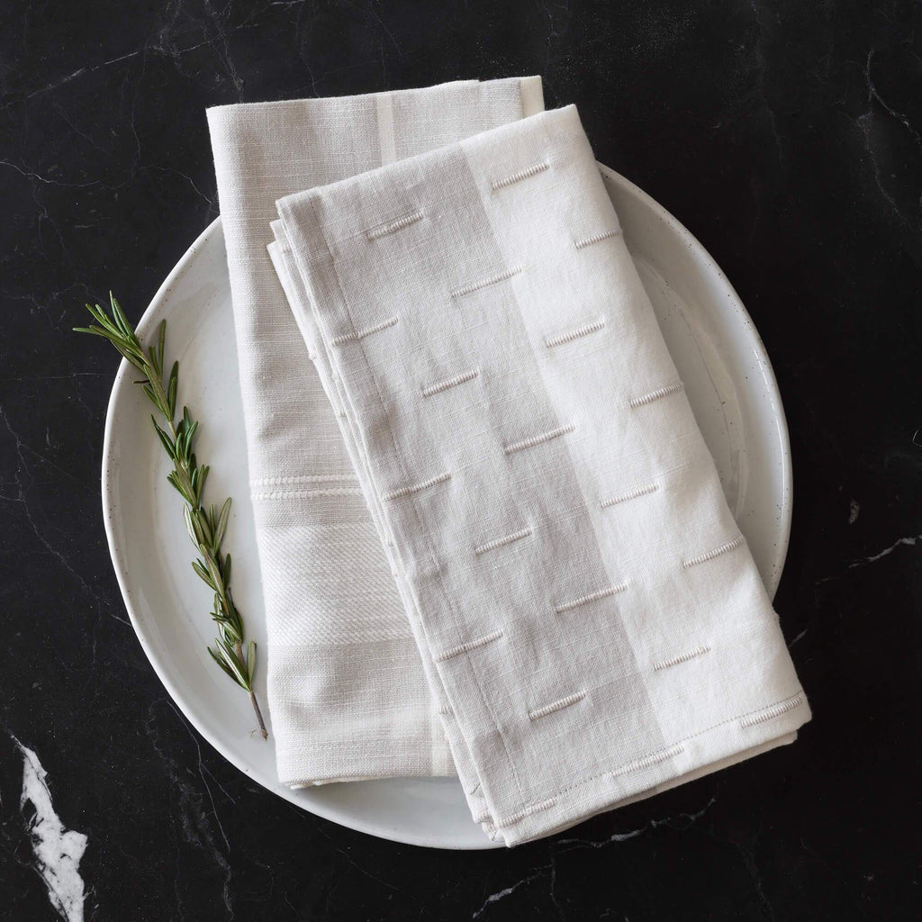 With a neutral, color-block design and hand-stitched detailing, this set of tan and natural napkins adds a modern, airy look to your table. Hand-loomed using locally-sourced cotton, this set is as durable (i.e. machine washable) as it is handsome.