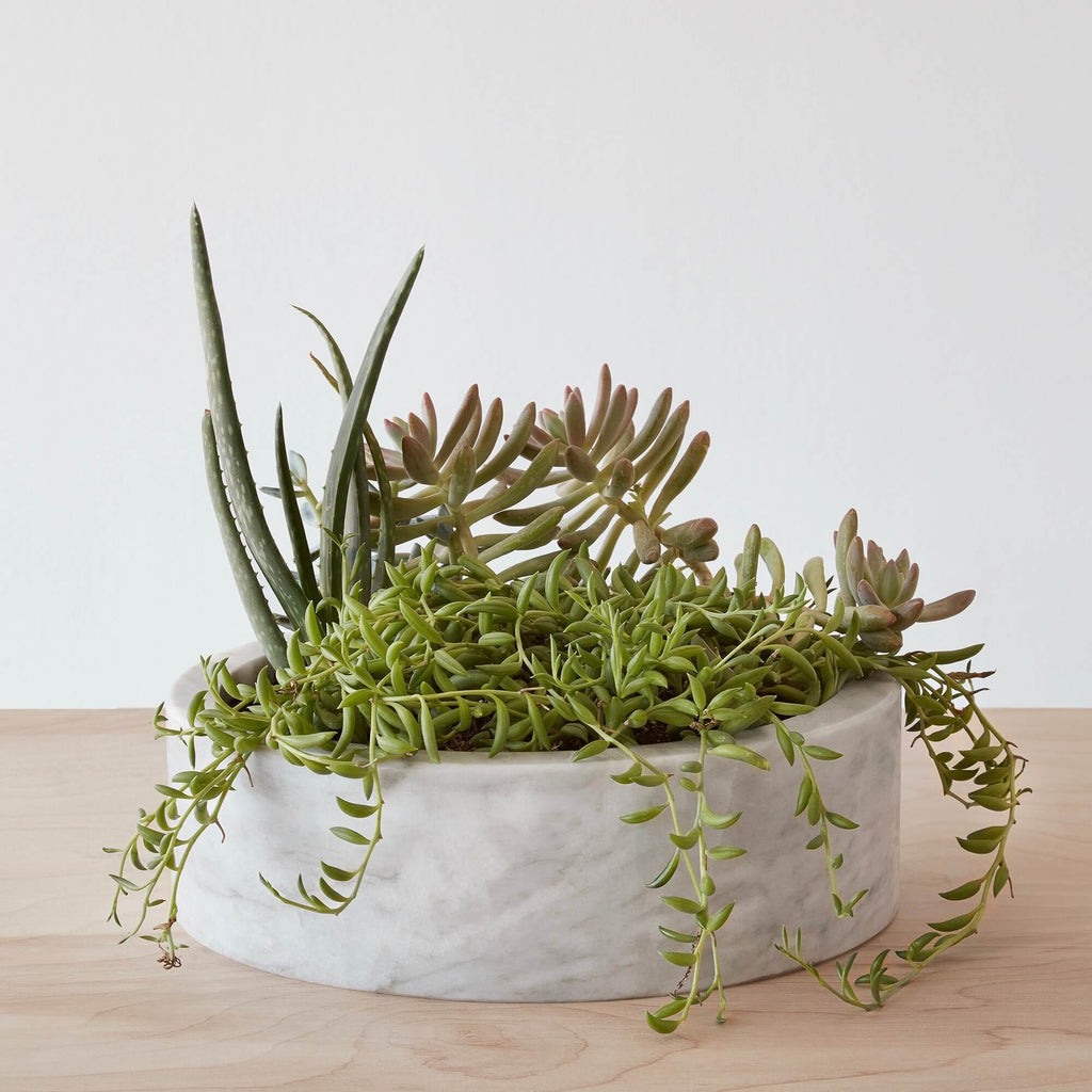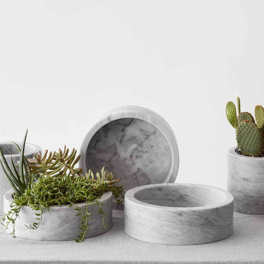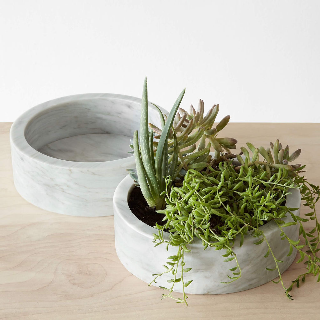 Light grey marble in simple, cylinder shape, this planter brings a modern, yet casual vibe to your space. Shallow in height and wide in diameter, style it as a succulent planter or as a kitchen catch-all.
