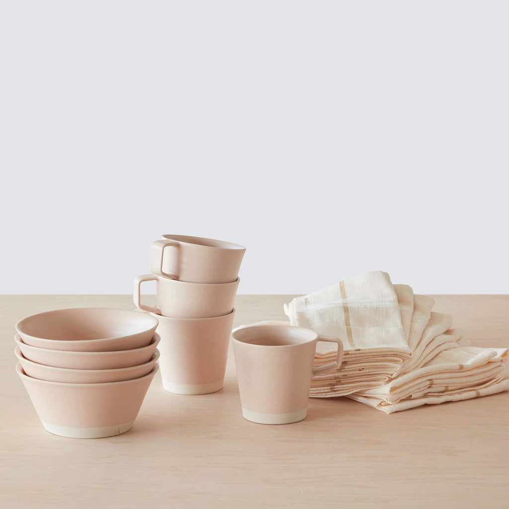 • COLOR: Halston Mugs & Bowls: Blush; Onam Napkins & Kitchen Towels: Peach, gold, and off-white