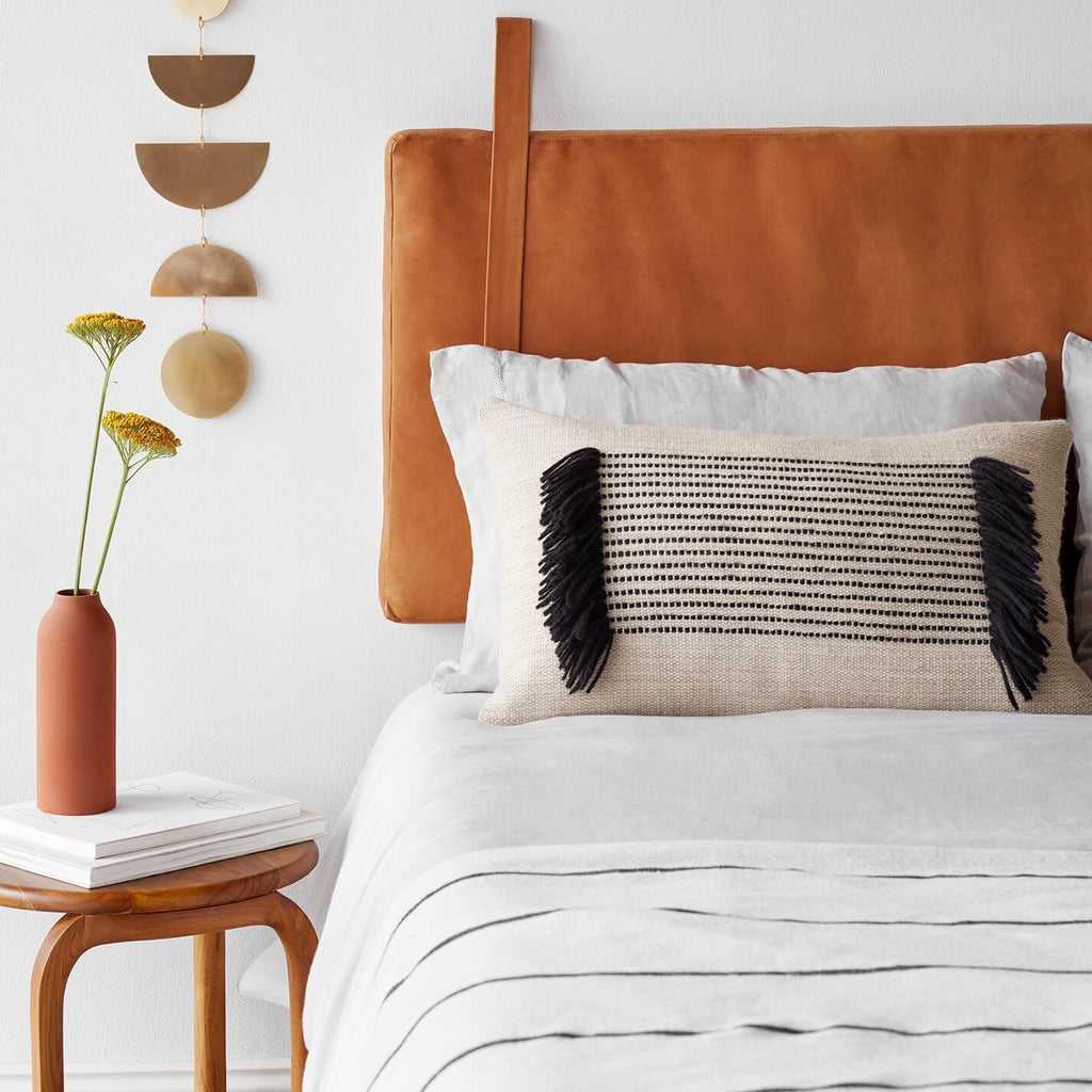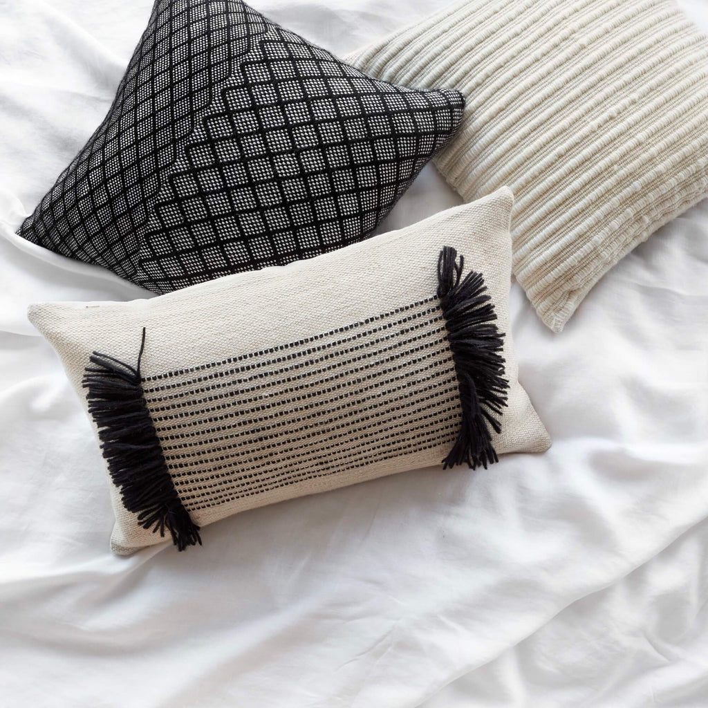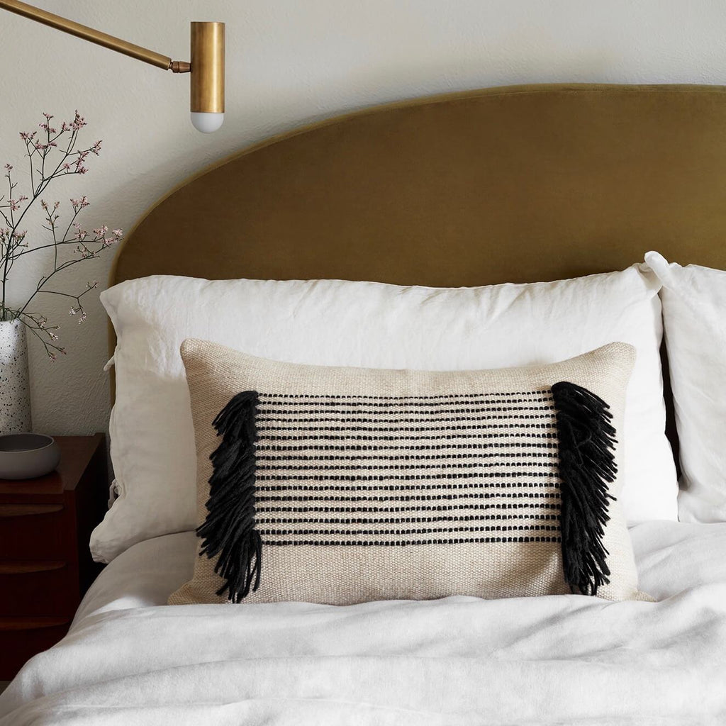 Classic palette with a hint of modern whimsy (re: eyelash fringe), this lumbar pillow is destined to be your throw-it-anywhere styling piece. A design-team favorite, this stunner’s woven detailing brings some serious style and texture to any couch or bed.