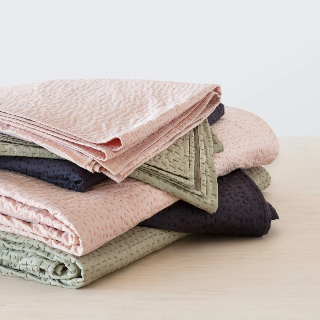 Meticulously dyed and stitched by hand, a modern take on India’s ancient art of kantha quilting.