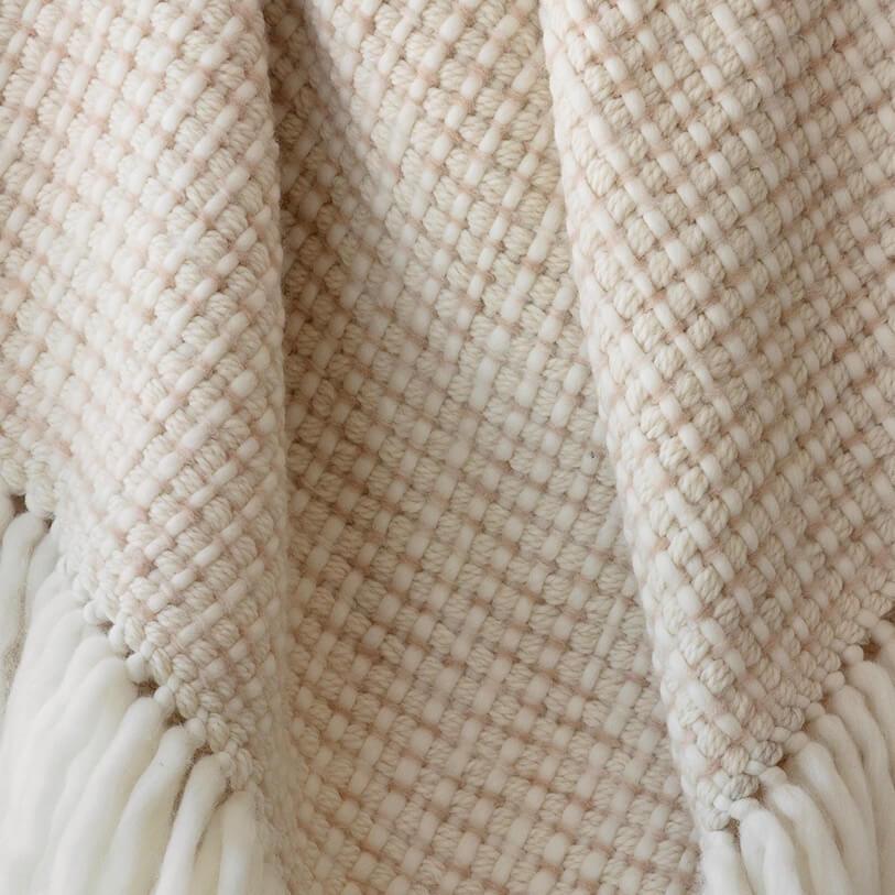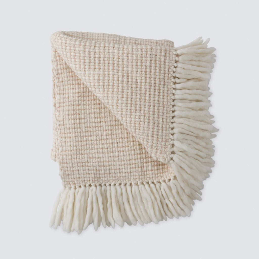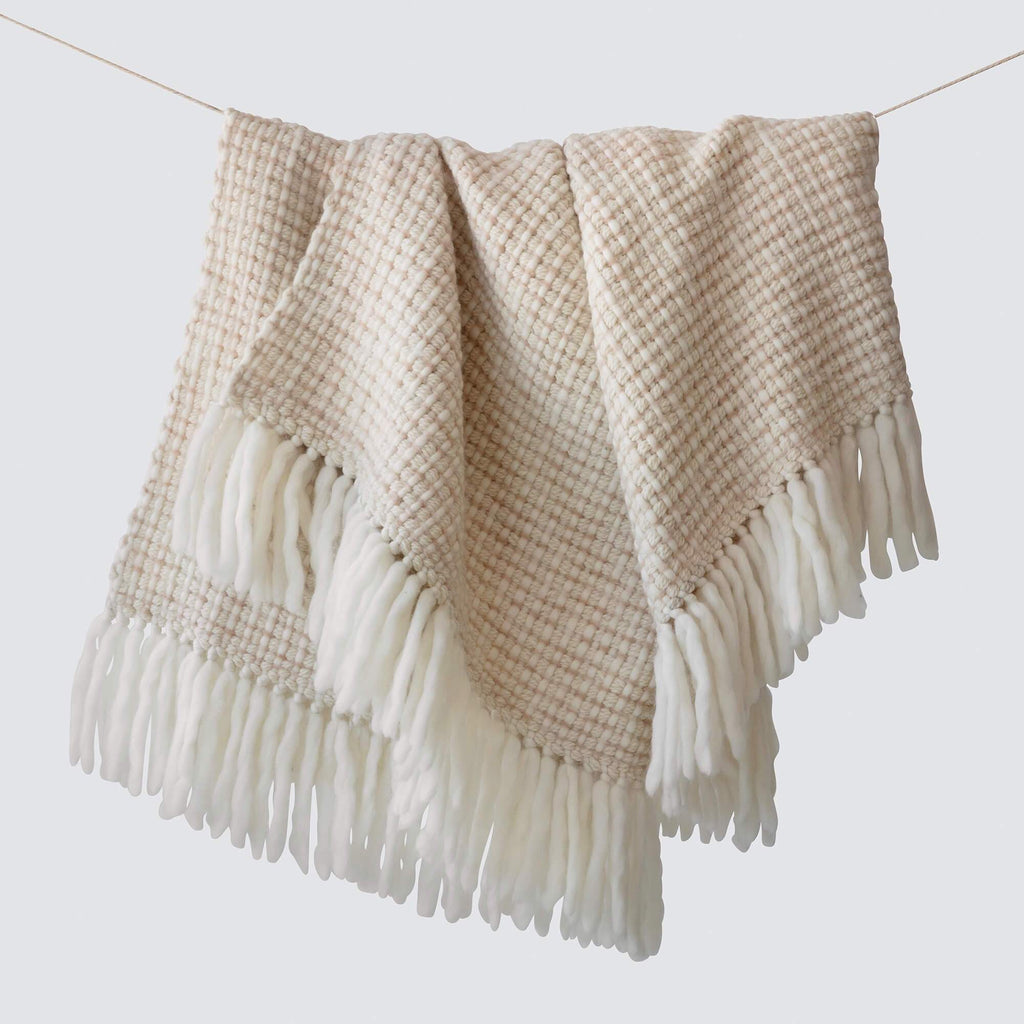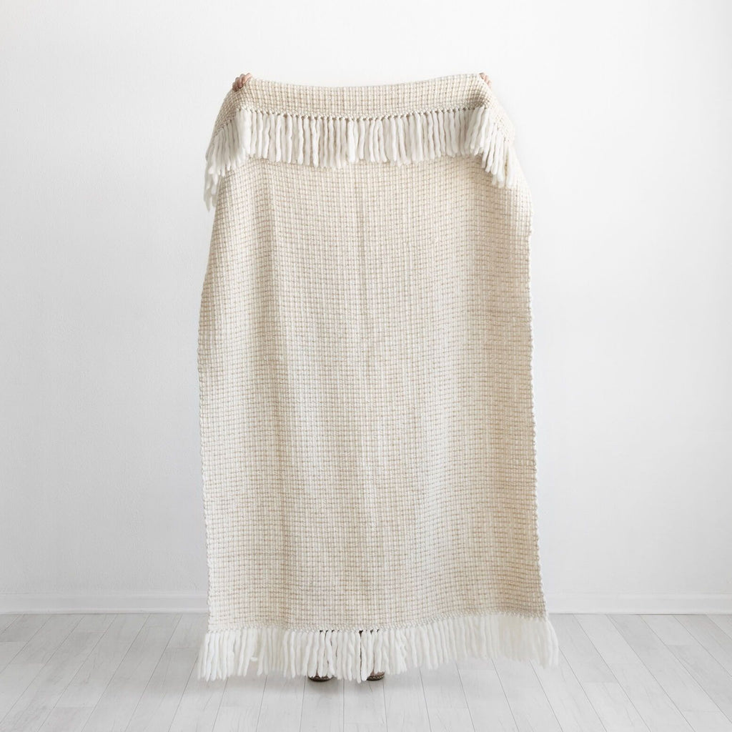 A luxuriously chunky throw hand-loomed from Peruvian highland wool, say hello to the perfect cozy-up companion. Featuring a warm, neutral palette of soft cream and tan and finished with fringe detailing, this ultra-thick wool blanket dials up the texture of any bed or couch.