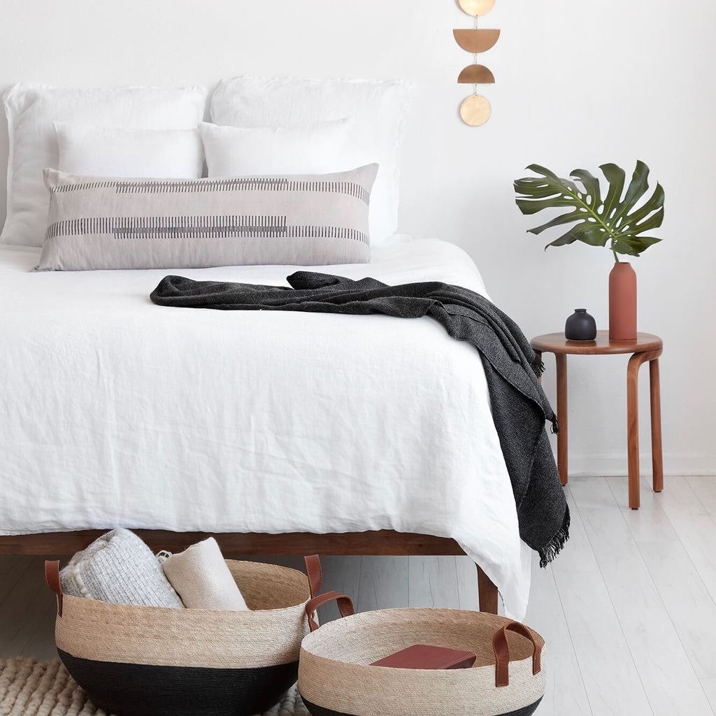 Architectural lines. Minimal palette. A modern, oversized lumbar to elevate the look of your bed. Meticulously block printed by hand, this pillow is crafted from crisp cotton and hand-dyed to perfection.