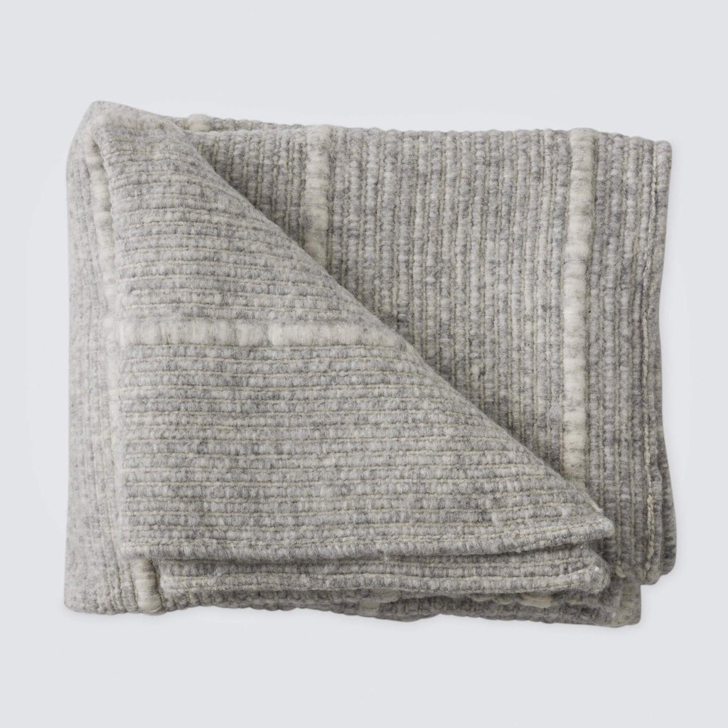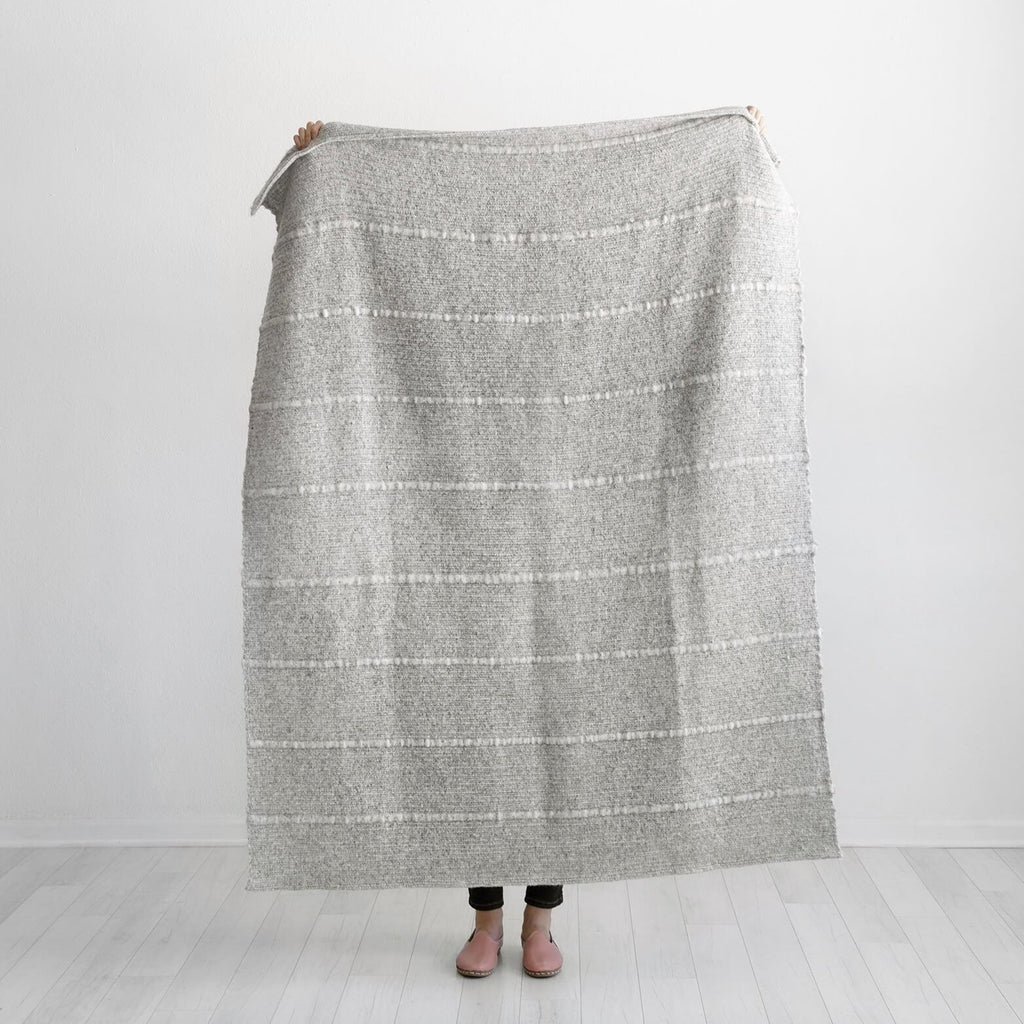 A luxe throw blanket in soft grey with classic stripe detailing. We cannot get enough of this super-think texture and oh-so-cozy feel. This blanket is destined to be your winter go-to for both styling and snuggling (hello, new movie and napping buddy).