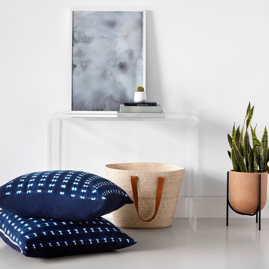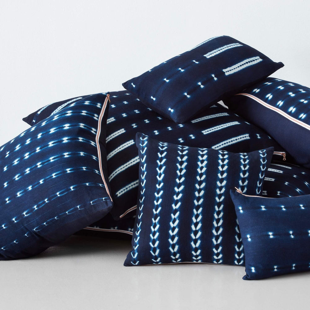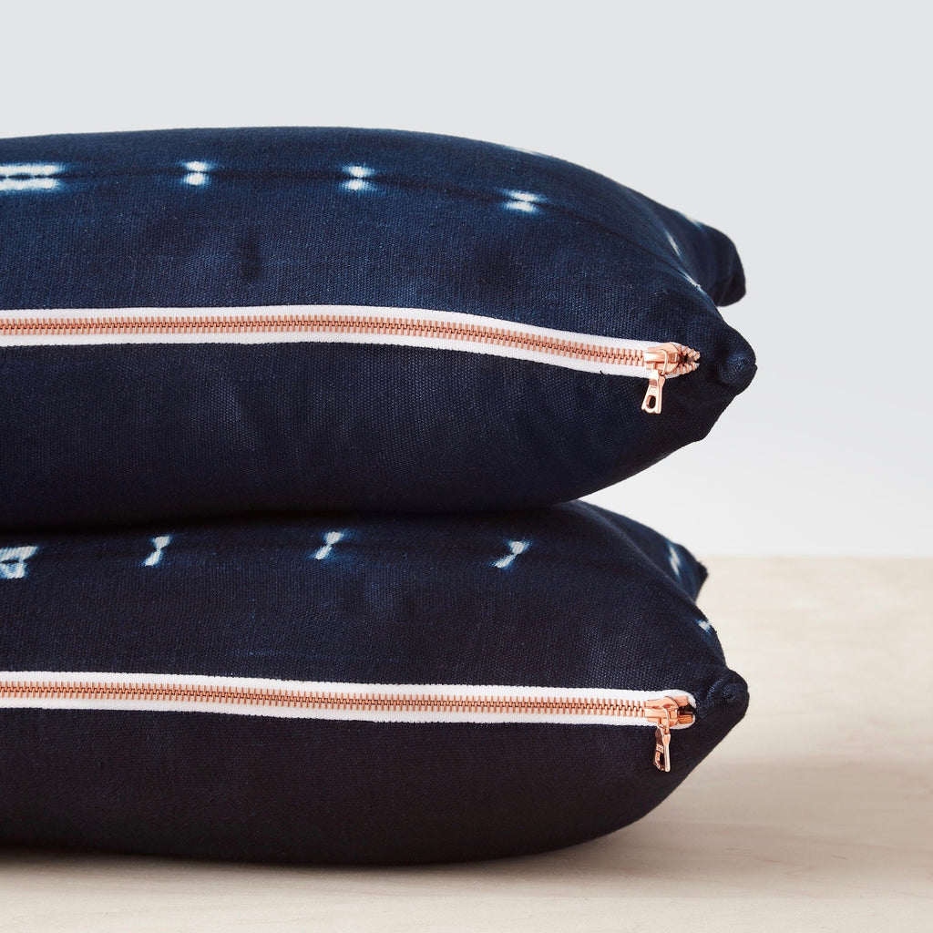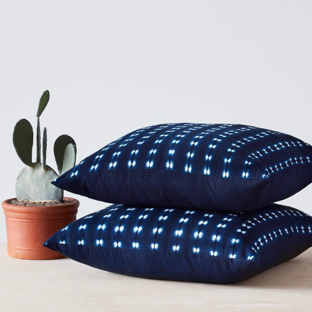 The indigo fabric is handcrafted by a fair-trade workshop in Bamako, Mali. The pillow is then constructed by Re:new Project, a Chicago-based studio that employs talented refugee artisans.