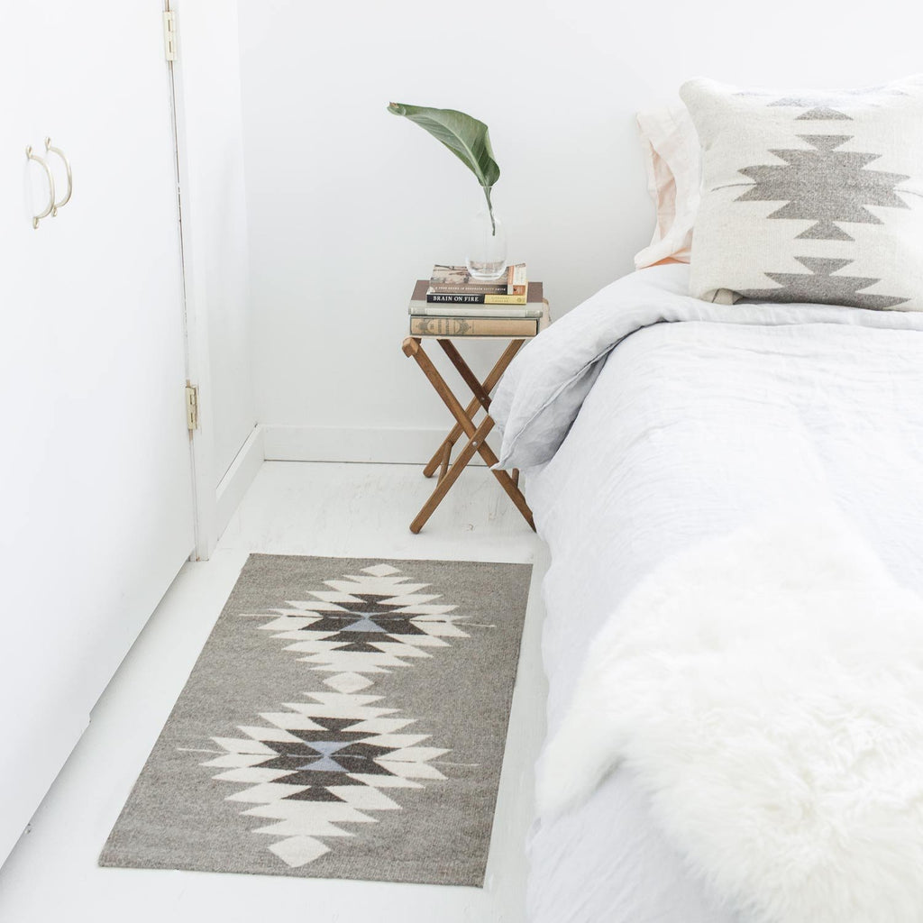 Hand-dyed using native plant extracts, this rug features a handsome combination of color. Its soft grey base, accented by dusty blue and charcoal grey, creates a striking, yet subtle palette that’s perfect for styling in a bedroom or kitchen.