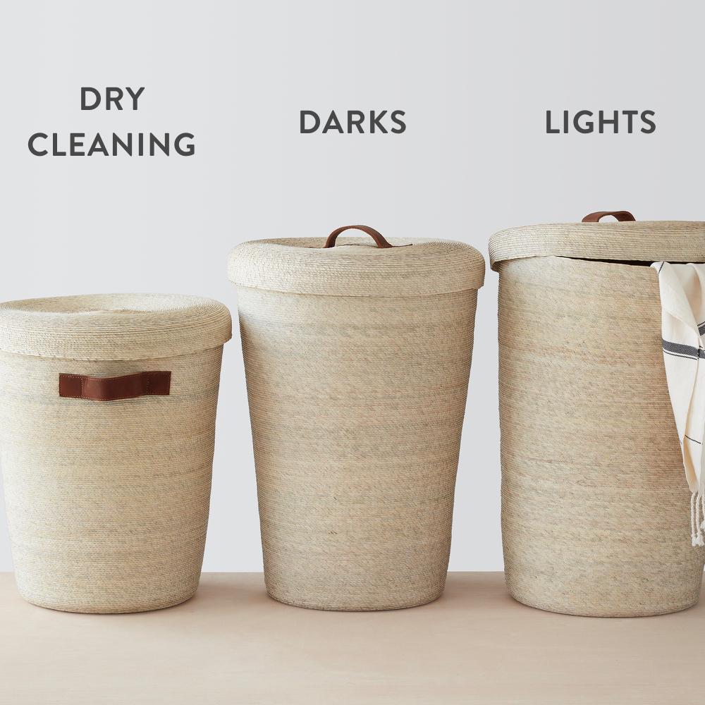 Meticulously handcrafted from lightweight, yet durable palm leaves and finished with luxe leather handles, this set of three hampers makes stashing laundry look good. Complete with two large hampers – one for darks, one for lights – and one medium hamper for dry cleaning (see side handles for easy toting), this set has you covered.