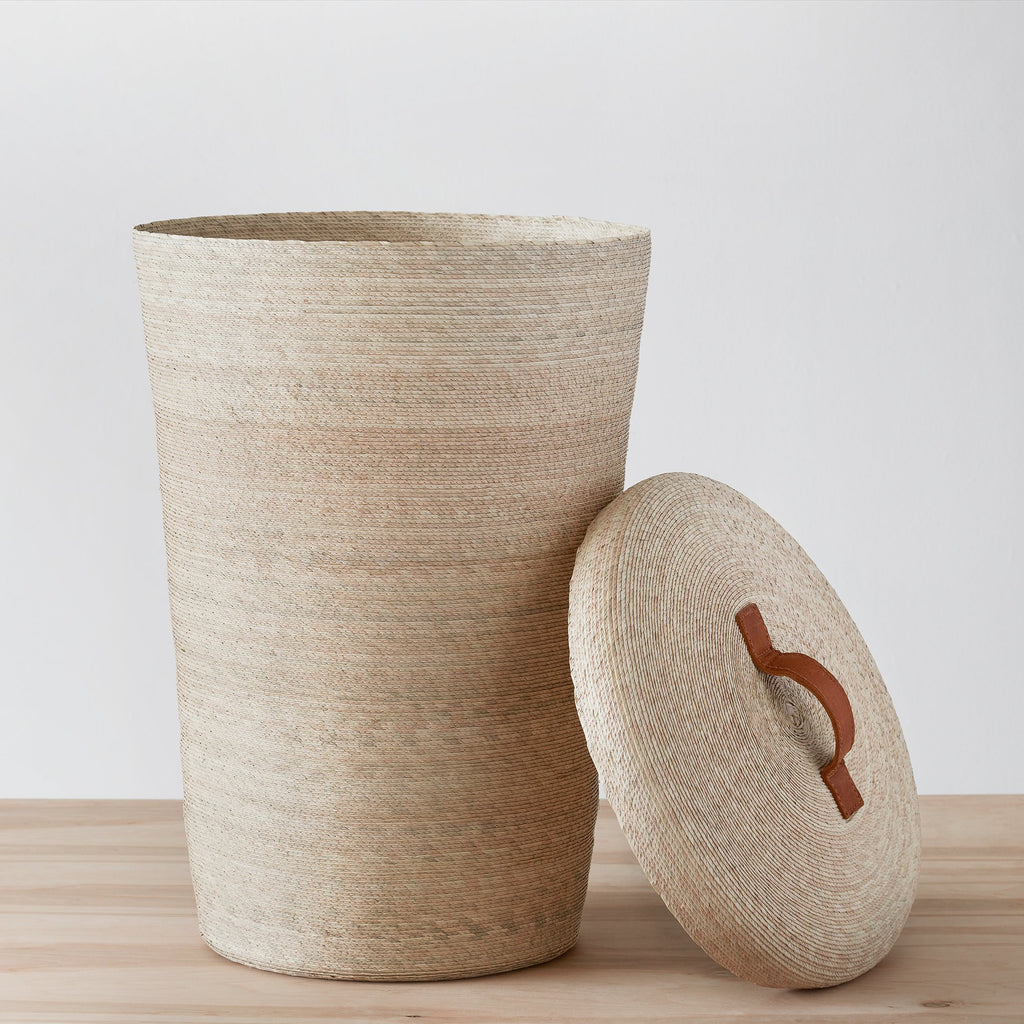 Large - 16.5"W (at top) x 24"H (with lid) - MATERIALS: Hand-braided palm leaves