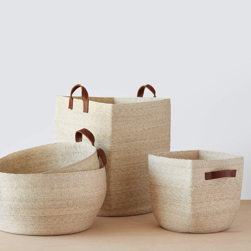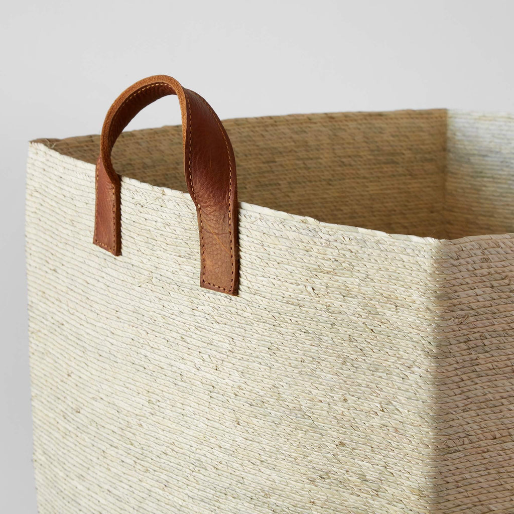 Handcrafted with Mexican palm leaves and topped with luxe leather handles, this oversized storage basket has mastered the art of stashing clutter. Designed in an extra roomy size, it is perfect for storing blankets, books, towels, toys – pretty much anything and everything.