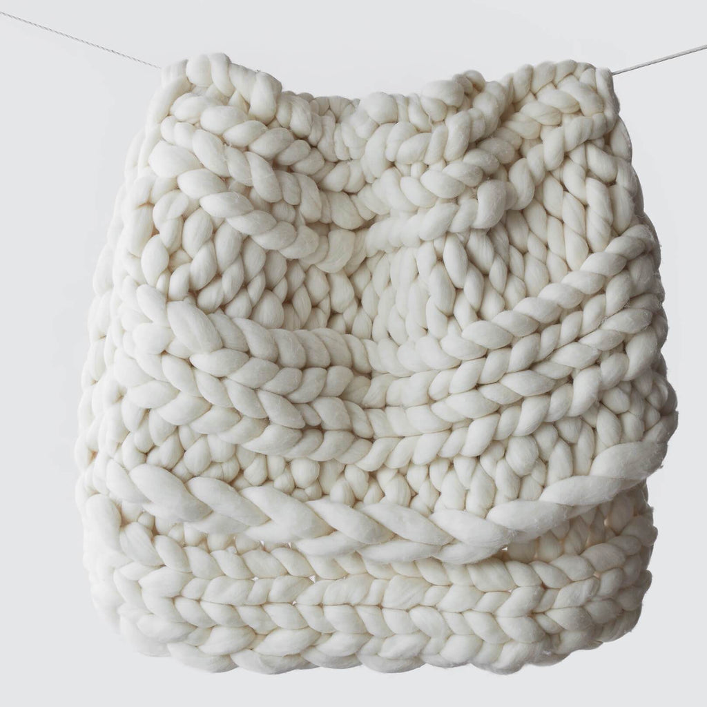Knitted entirely by hand, this ultra thick throw is made from luxe, unspun wool.