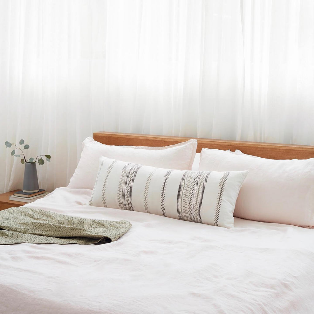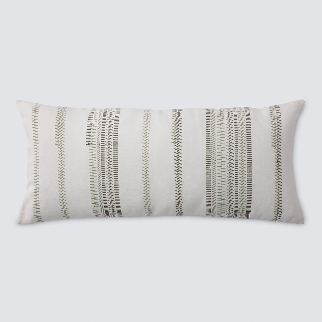 A modern take on India’s ancient art of block printing, this oversized lumbar pillow turns heads with its clean, architectural lines. With a fresh palette of crisp, white cotton and soft olive accents, it brings a calming, elevated look to any bed.