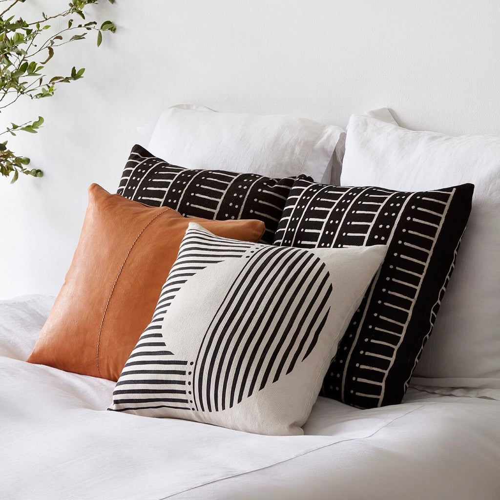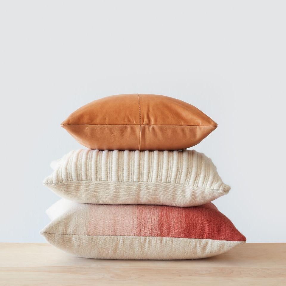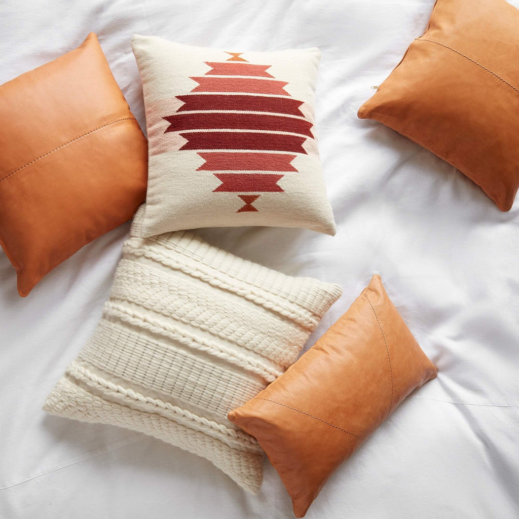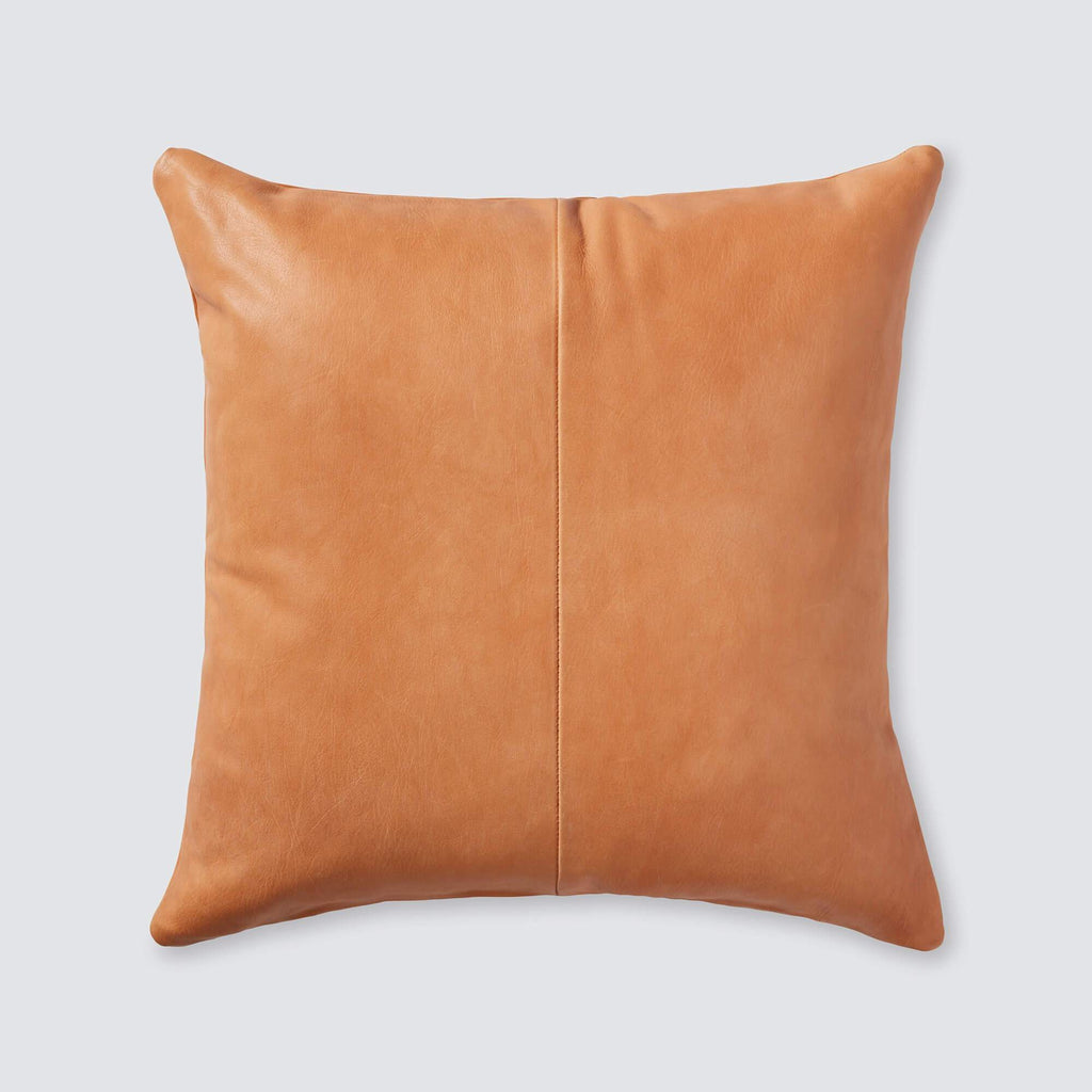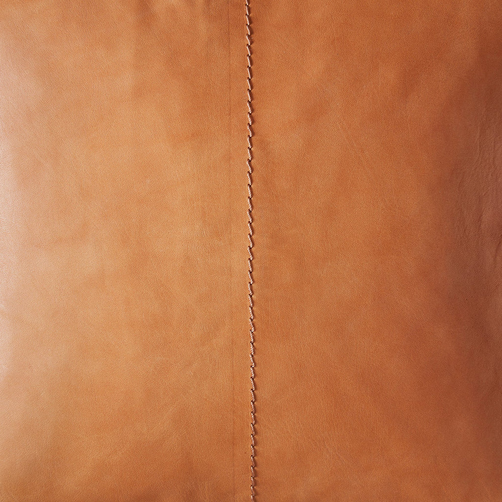 Rich, buttery soft leather hand-stitched in a modern accent pillow. This piece instantly elevates the look of any pillow combination with its warm, caramel hue and luxe material.
