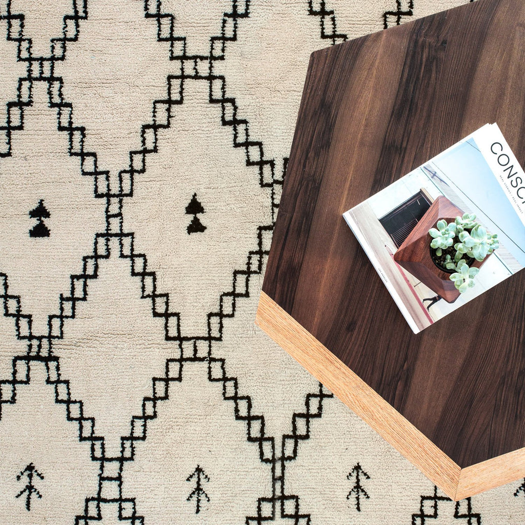 This black and cream rug features the iconic patterns of the nomadic tribes in Morocco’s High Atlas. Masterfully hand-knotted using thick sheep’s wool, this pile-knot rug is one of the softest and most luxurious rugs your feet will ever touch.