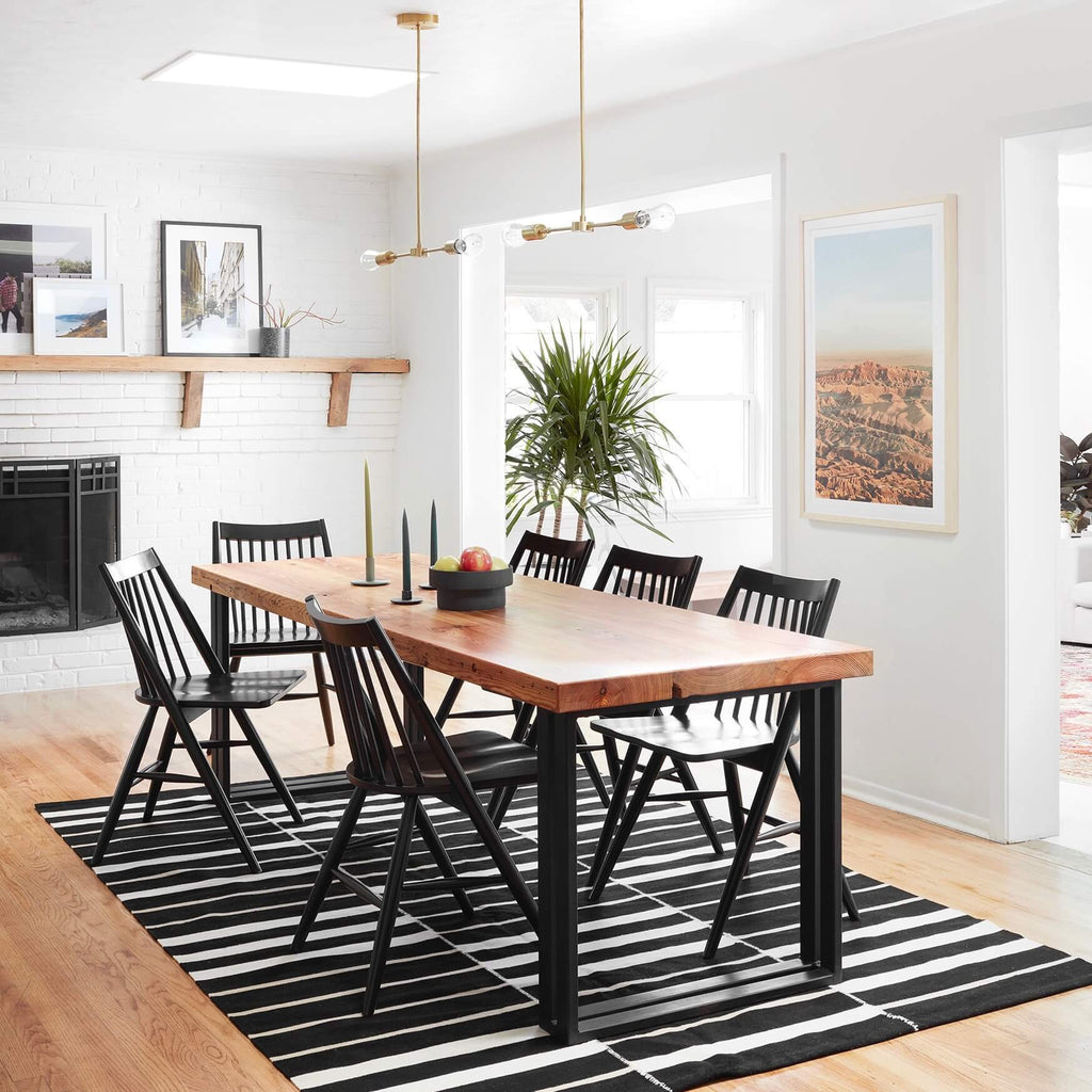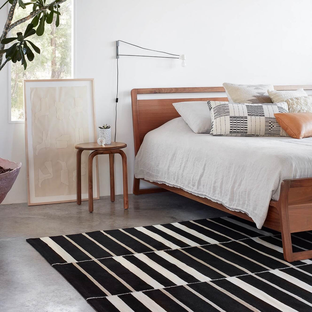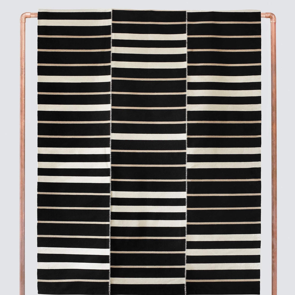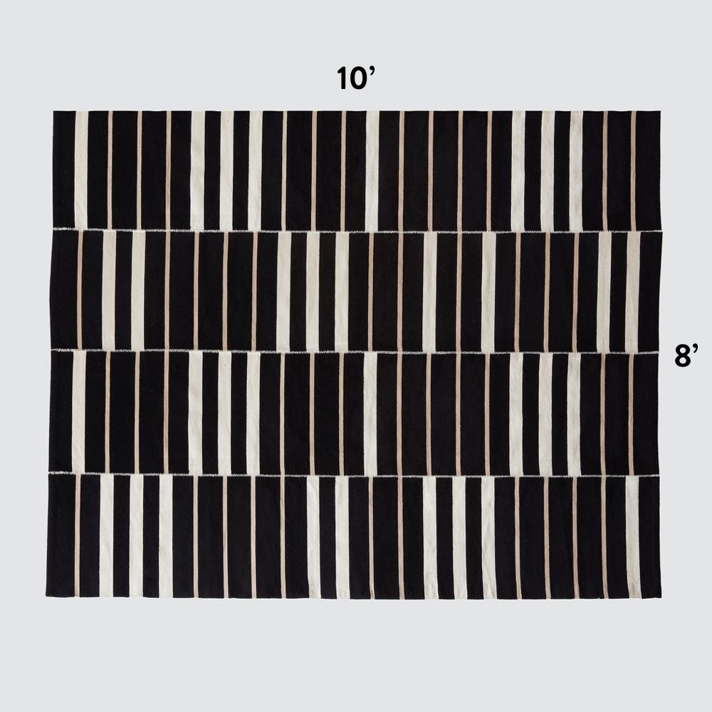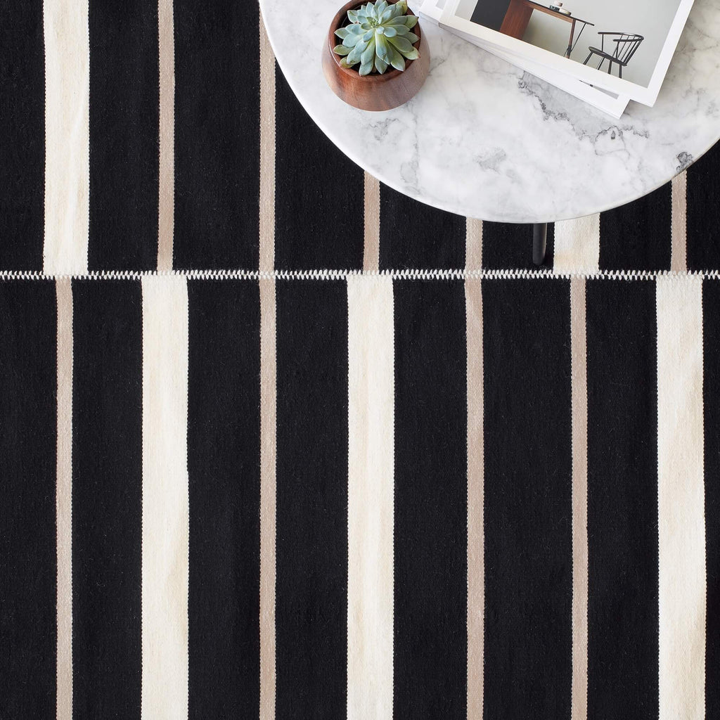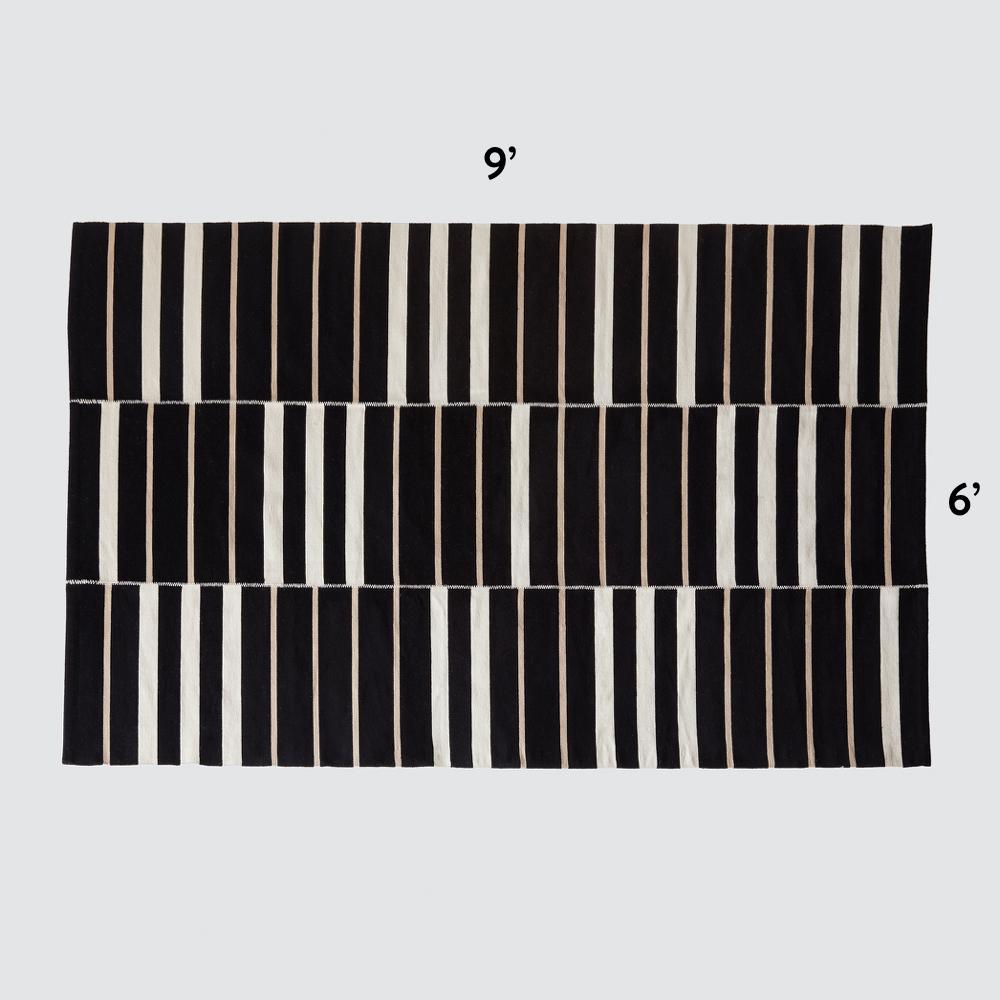With a classic color scheme and minimal design, this handwoven area rug is the ideal foundation for your space. Master weavers add a luxe, hand-stitched detail to connect each panel – with a high-contrast cream hue, this design element pops against the dark base.