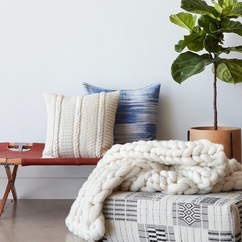 Handcrafted with organic cotton, each pillow takes almost two days to complete. All made exclusively by a fair trade collective in Waraniéné, Côte d’Ivoire.