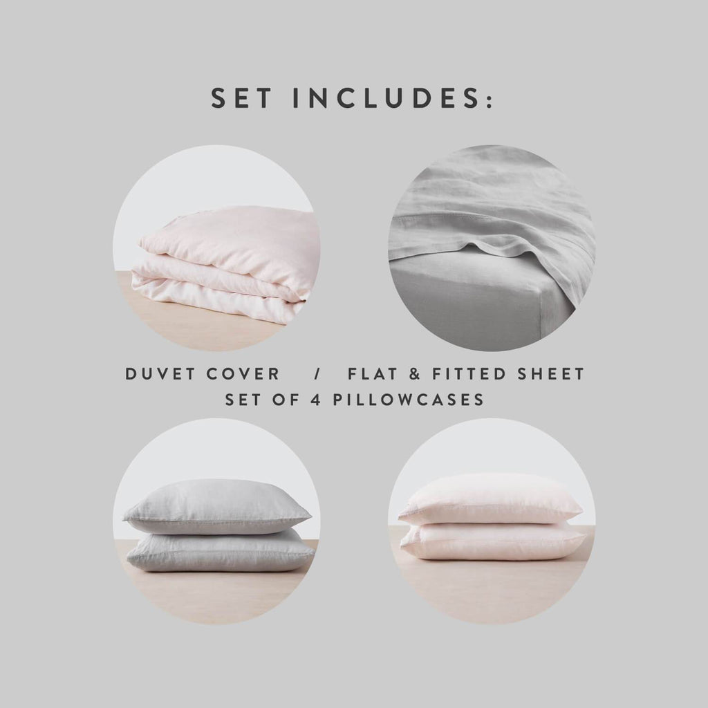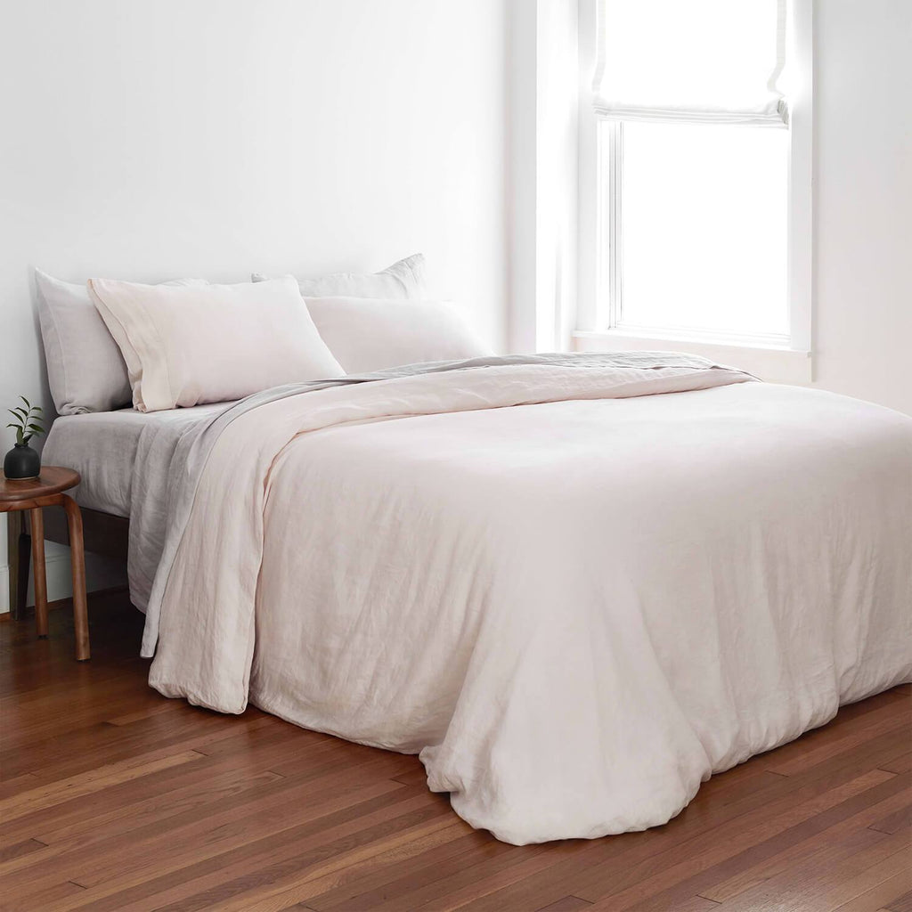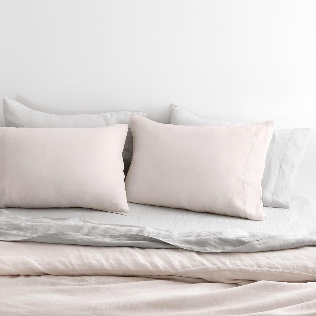 With soft earth tones of dusty blush and light grey, this linen bedding set brings a serene look to any bedroom. Made using the finest French flax linen and stonewashed for a relaxed, perfectly imperfect look, this bedding is light, breathable, and incredibly soft.