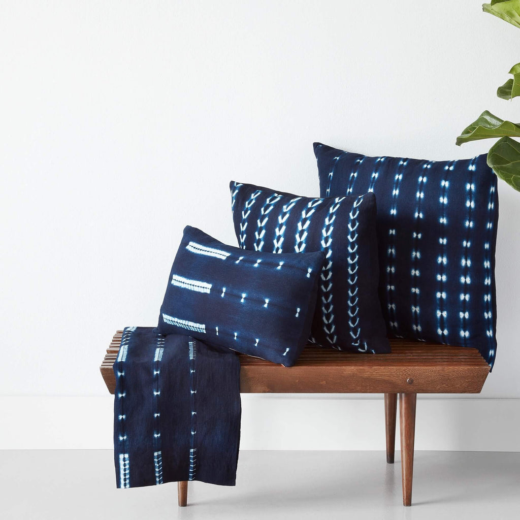 Indigo-dyed cotton has been treated to resist fading or bleeding; however, natural dyes may transfer to furniture or clothing. Avoid unnecessary contact with water or moisture. Dry clean only.